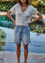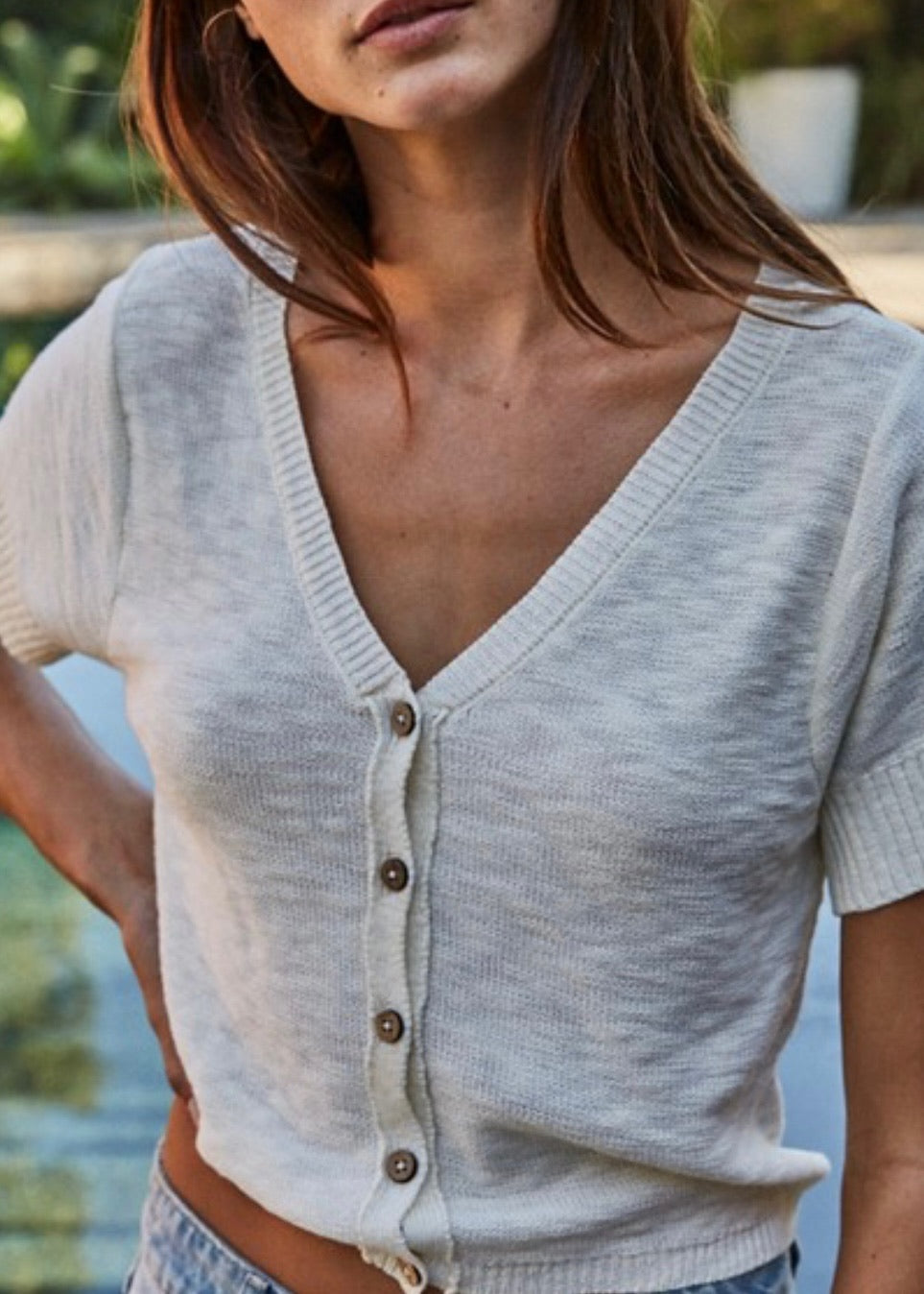 This short-sleeve cardigan features a V-neck design and button-down front, crafted from a cotton-viscose knit blend for comfortable wear. Ideal for layering, it combines softness and breathability in a versatile top.