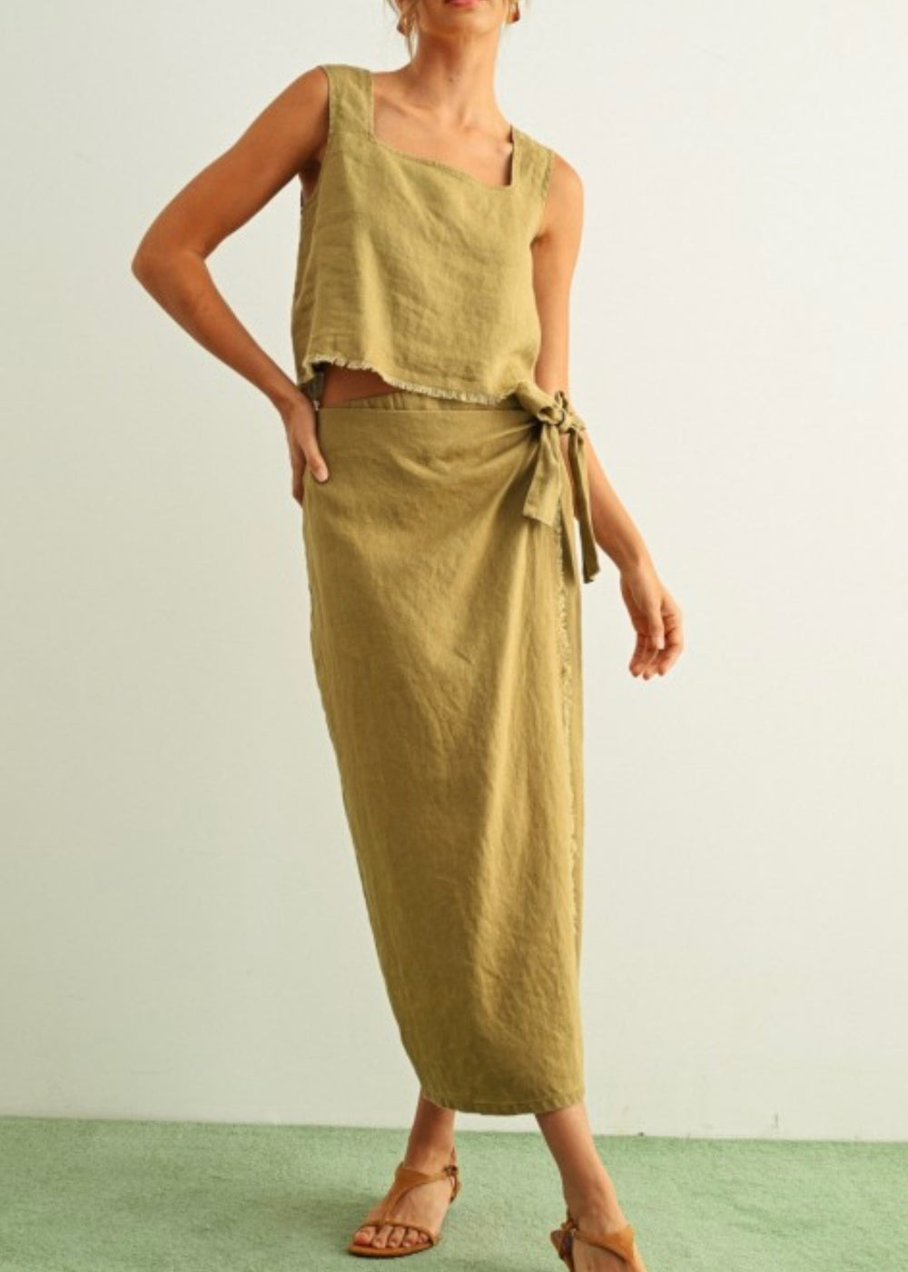 Effortlessly chic and undeniably versatile, this wrap skirt is crafted from 100% linen for breathable comfort all day long. T Perfect for warm weather adventures, casual outings, or whenever you want to feel put-together without trying too hard.