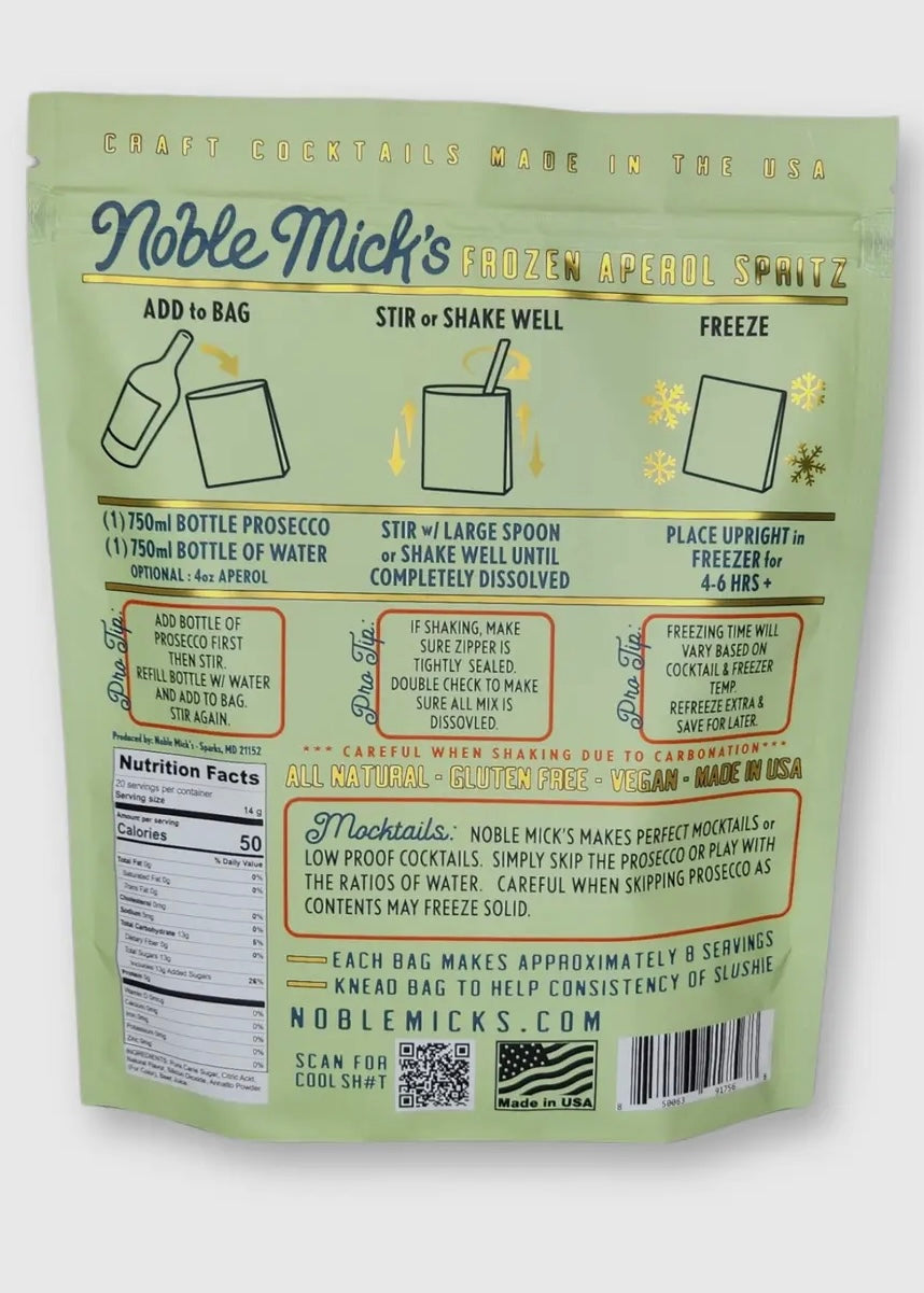 Frozen Cocktails don't get easier than this! Each bag makes 8 servings. No blenders ever! Simply add 1 bottle of Prosecco and 1 bottle of water (optional splash of Aperol) shake or stir and throw in the freezer. Then serve right from the bag. Our Frozen cocktails are unique in you ONLY ever add water and spirit...NEVER any juice, mixers or additional flavors. Thats one of the things that sets us apart. 100% all natural ingredients and perfect to share with friends and family at your next party. Cheers from Noble Mick's