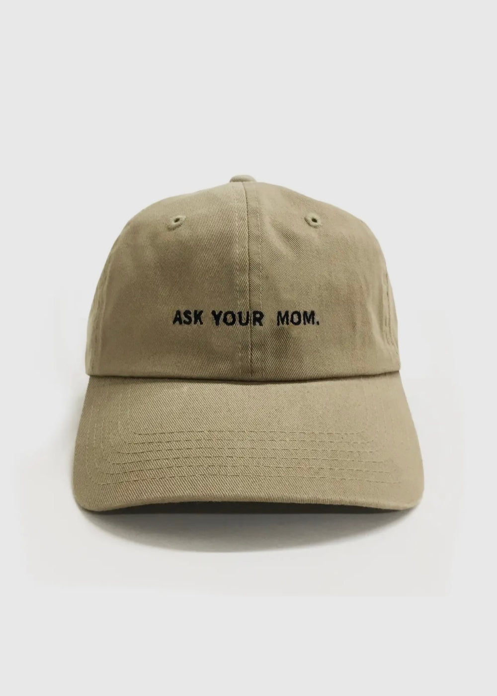 Tan 6-Panel Dad Hat • 100% Cotton • Adjustable strap • Embroidered Ask Your Mom text