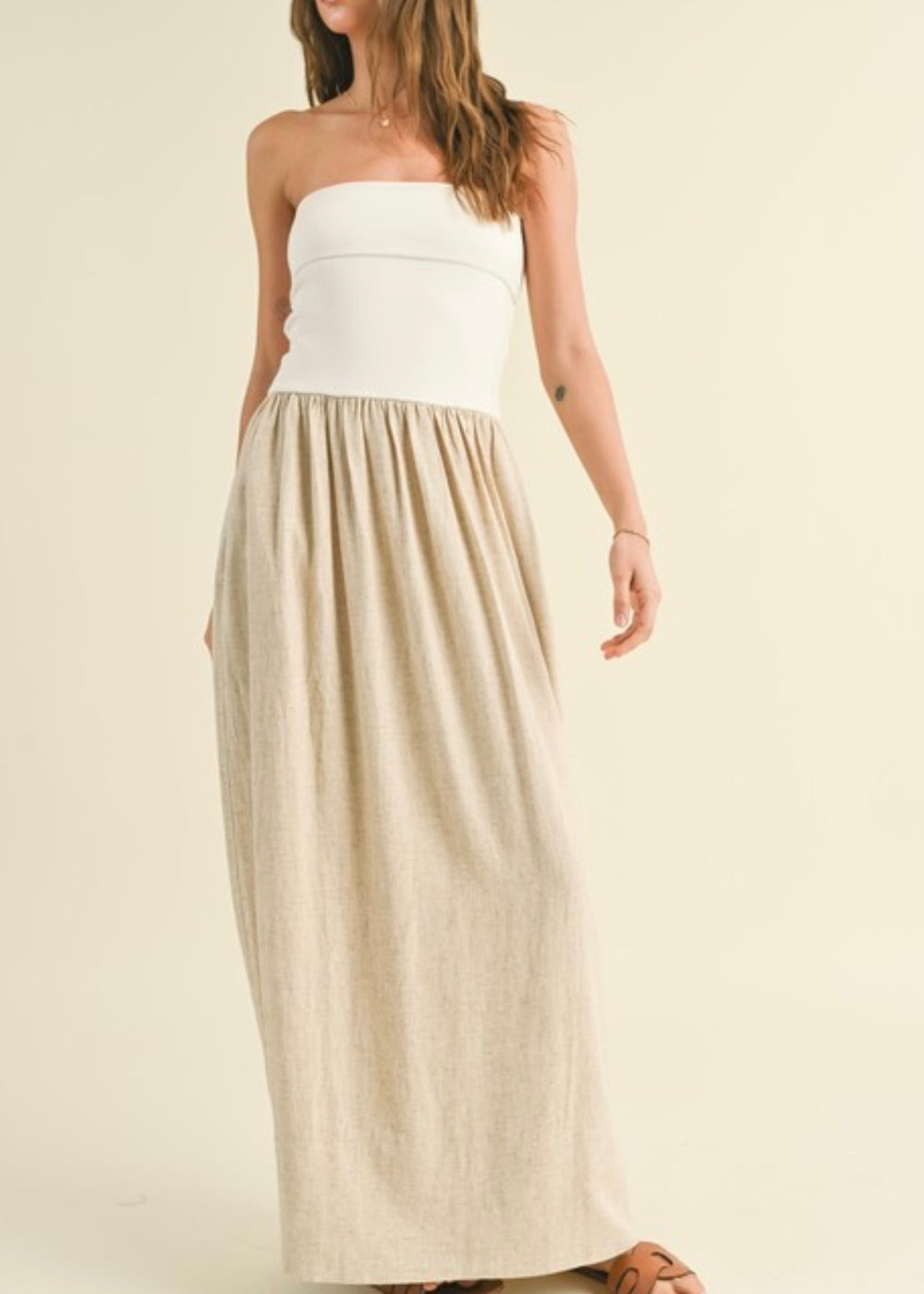 The Blanca Strapless Dress is shown here in size S. Measurements for size S are: Height - 5' 7 1/2" (175.3 cm), Bust - 33", Waist - 24", Hips - 34". The fabric is composed of 70% polyester and 30% linen, offering a refined blend of durability and breathability.