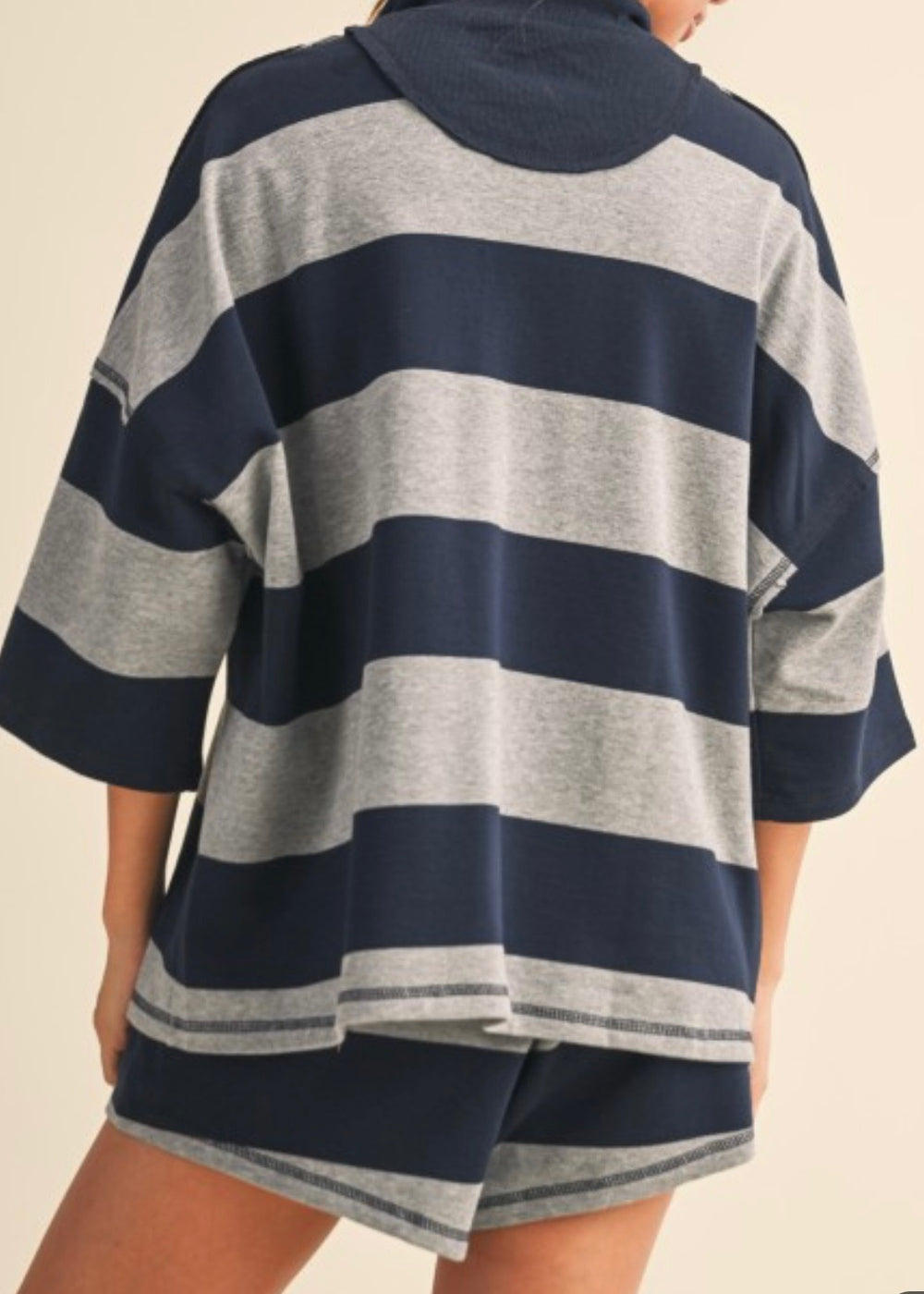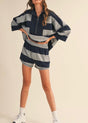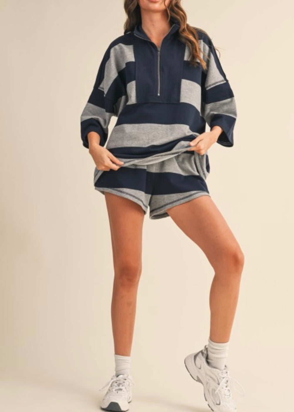 The Blue Ease Lounge Set features a striped zip-up oversized top paired with matching shorts. Crafted from a fabric blend of 55% cotton and 45% polyester, with a secondary composition of 65% cotton, 30% polyester, and 5% spandex, this set offers both comfort and flexibility.
