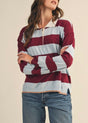 The Blue Eyes Rugby Top features a striped rugby sweater design with a collared neckline and button placket. It offers drop shoulder long sleeves and a relaxed, slouchy pullover fit. Finished with ribbed details on the collar, cuffs, and hem, this top combines classic style with comfortable wear. The model, standing 5' 7.5"