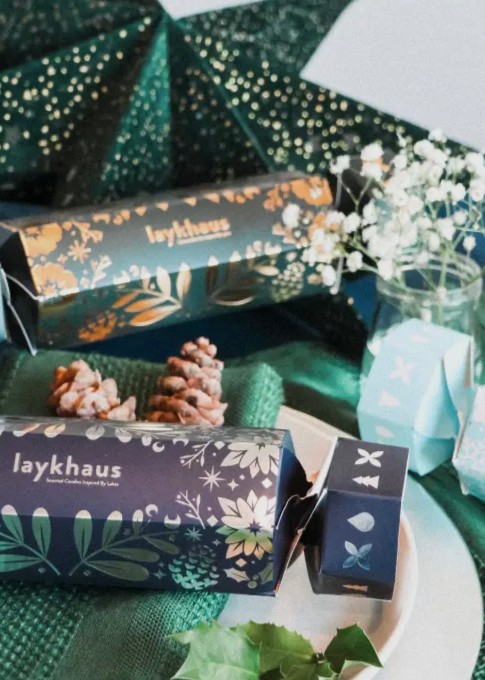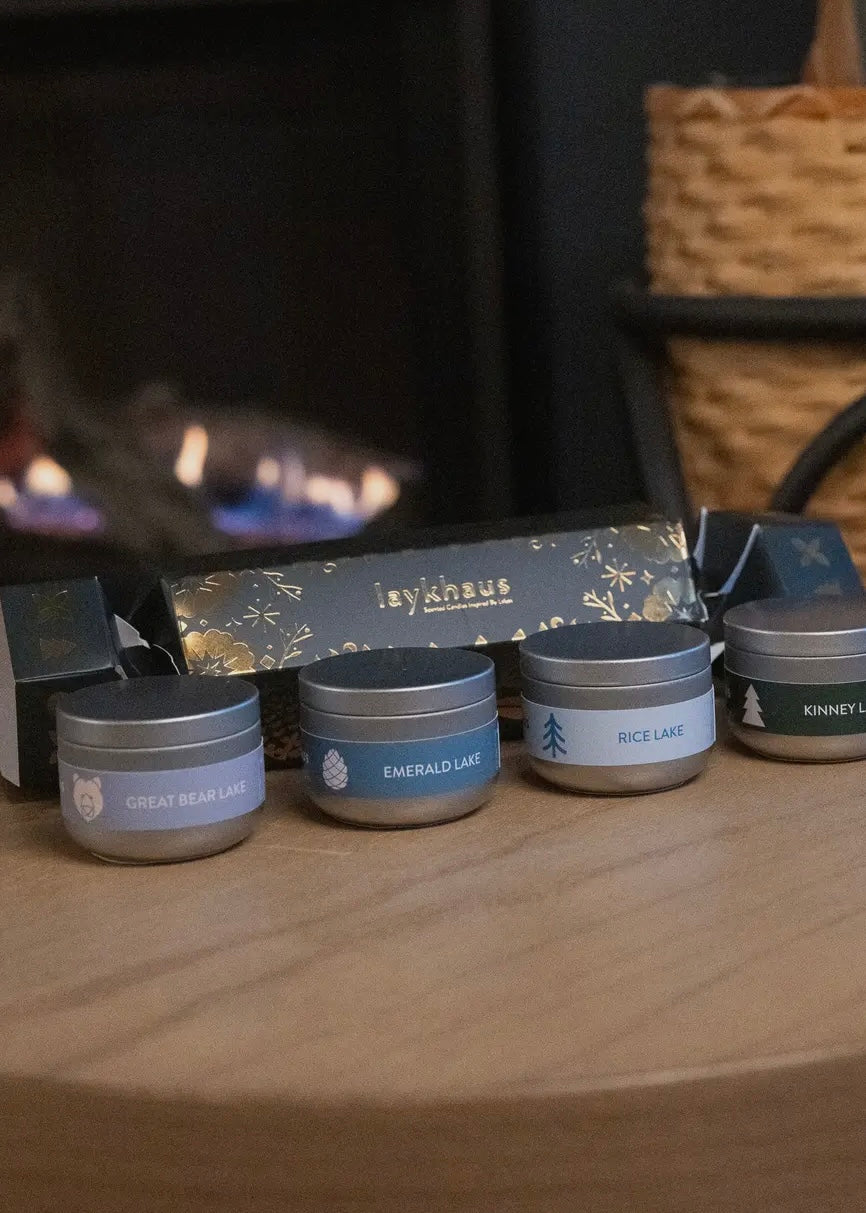 Contains 4 x 2oz Mini candles: • Cabin Lake: Winter Spice • Reindeer Lake: Wood Sage + White Moss • Muskoka Lakes: Midnight Embers • Lightning Lake: Alpine Meadows Share the spirit of the True north with this thoughtful gift. These mini candles, packaged in a festive cracker, are perfect for outdoor enthusiasts and those who appreciate the great outdoors. Silver Foil on Navy Blue Cracker design