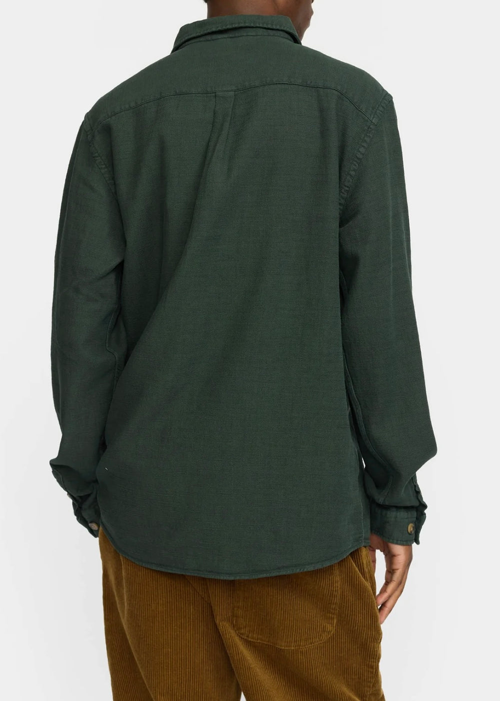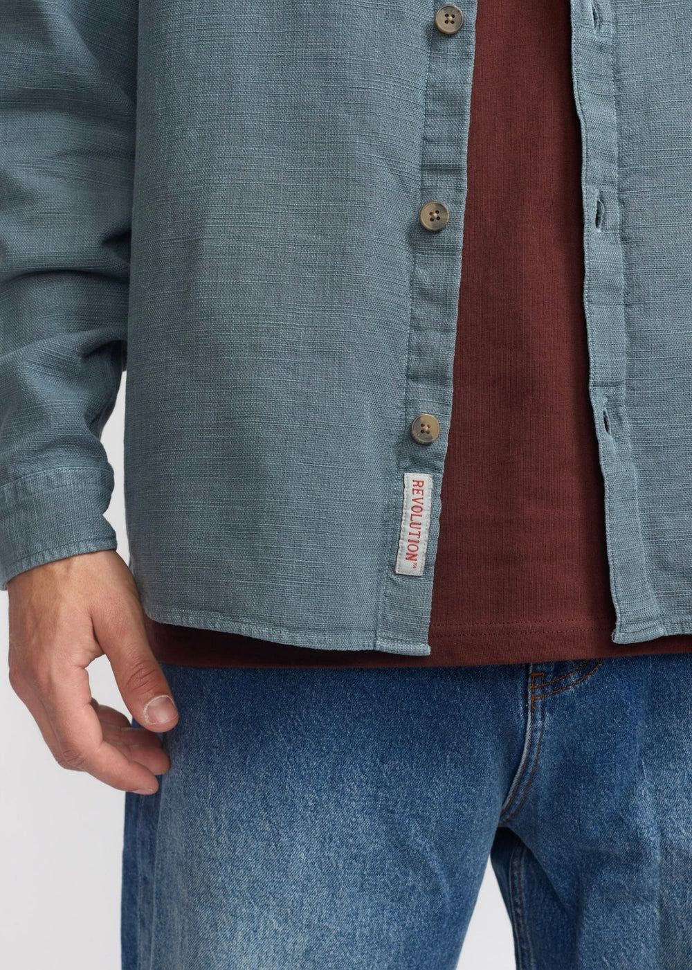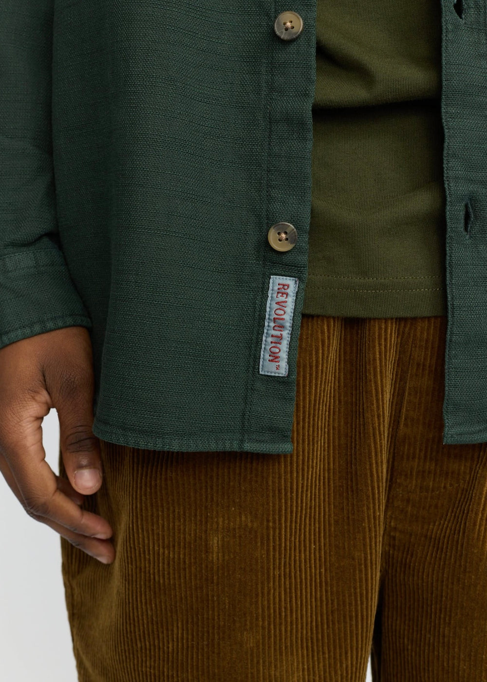 A loose shirt made of a mid-weight organic cotton fabric, with a characteristic coarse structure. This Revolution wardrobe stable overshirt features a square patch-chest-pocket, a button-up front finished with horn-look buttons and an adjustable cuff. The hem is curved for easy layering, and the back is designed with a traditional double-layer yoke with a box-pleat for extra comfort.