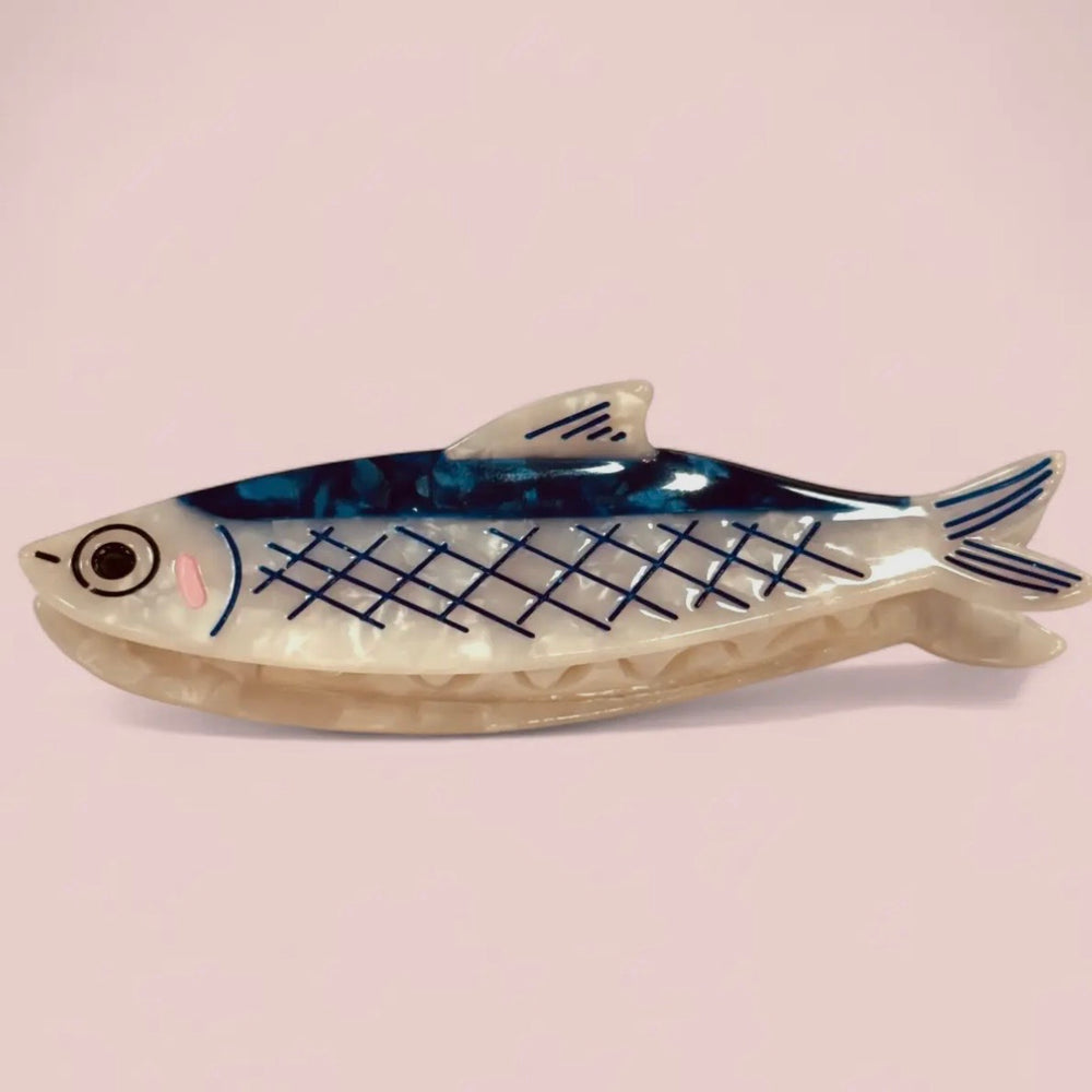 Blue and white Anchovy hair claw. Made from cellulose acetate, a plant-based alternative to plastic. Lovingly designed by Carolyn Suzuki in Los Angeles, CA.