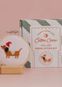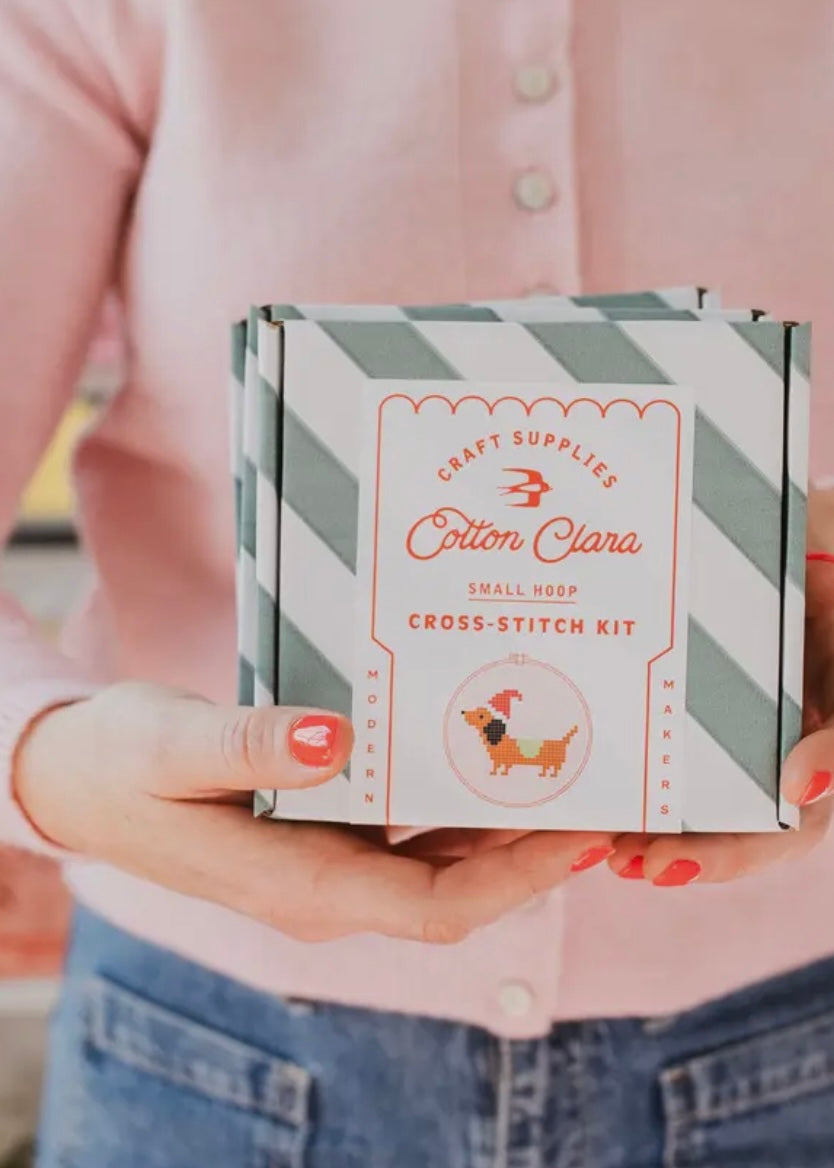 Dachshund Mini Christmas Cross Stitch Kit – 9cm Hoop This festive Dachshund cross stitch kit is the perfect cosy project for winter crafting or gifting. Featuring an adorable sausage dog in a seasonal design, it’s ideal for beginners and experienced stitchers alike. The kit includes a 9cm wooden hoop, coloured aida fabric, embroidery thread, needle, wadding, gingham hanging ribbon, optional ‘Merry Christmas’ ribbon, full instructions, and a backing disc for easy display. Designed and made in the UK, this contemporary mini cross stitch kit is beautifully packaged in our signature striped box and uses fully recyclable, plastic-free packaging.