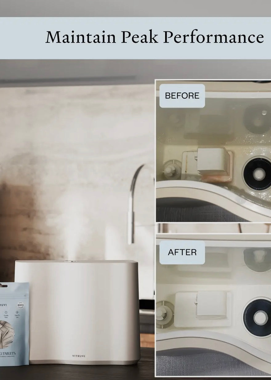 Keep your diffuser or humidifier in its best condition with Vitruvi Cleaning Tablets. Designed to eliminate hard water stains, essential oil residue, and mineral buildup, these tablets improve performance, maintain scent purity, and prolong the life of your Diffuser or Humidifier. In just a few minutes, these tablets provide hassle-free, safe, non-toxic, fragrance-free, and cruelty-free cleaning. Made with natural ingredients, these tablets are an easy addition. Perfect For: Preventing unhealthy mold and mineral buildup Preserving device performance and longevity Maintaining fresh, clean scenting Easy, no-scrub cleaning