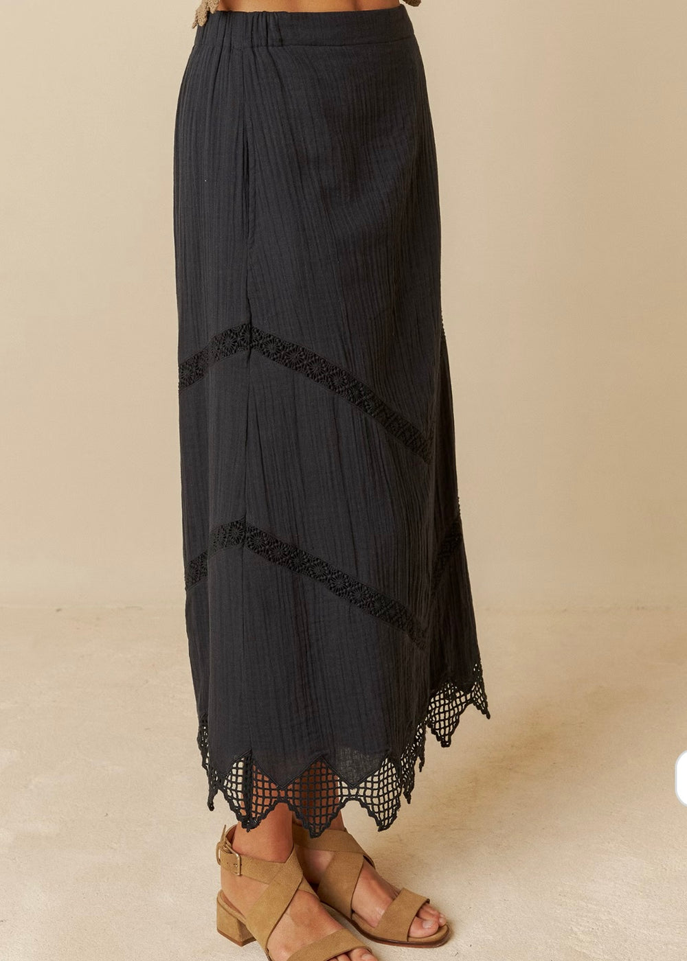 We love the double gauze skirt in organic cotton for its elastic waist, hidden side pockets and lace inserts. A must for the season.