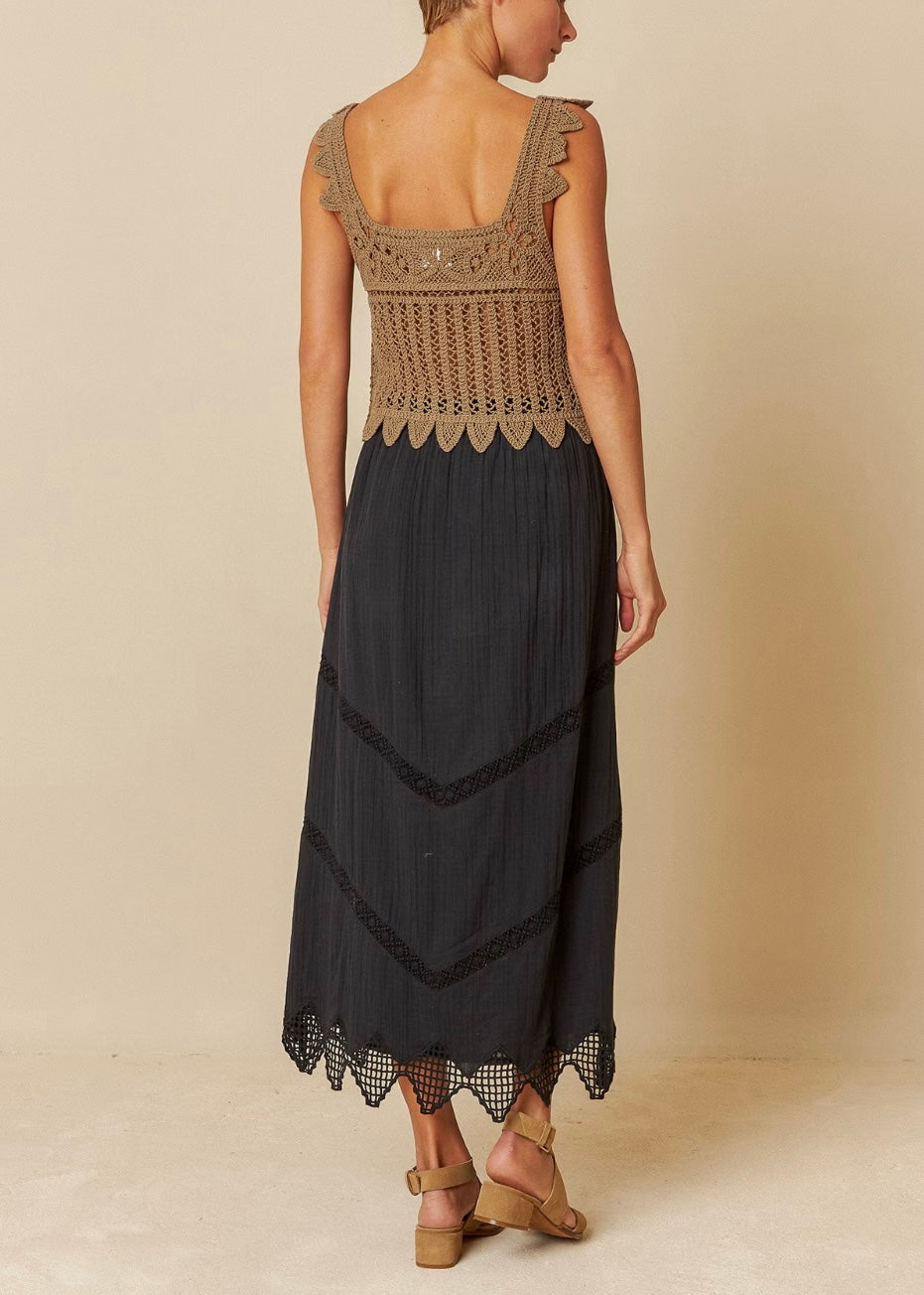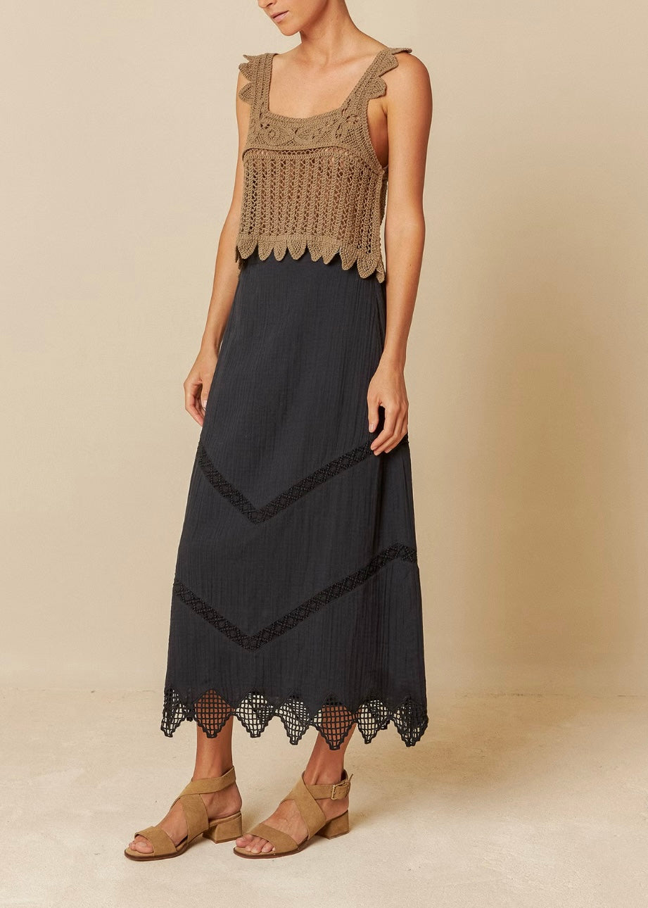 Mid-rise with back elastic waistband. • Organic cotton double gauze fabric with lace insertions and crochet details on hem. • Regular fit: designed to wear as a standar fit. • Measurements on size 36 flat.waist: 35cm. Total length of garment: 90cm. • Sizing: each garment increases in length by 1cm per size.