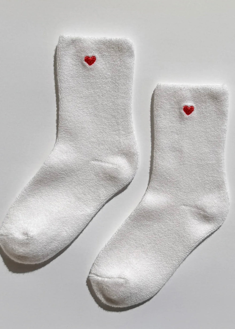 Like walking on clouds! These are hands down the comfiest and cutest socks to wear all year long. Made from a fluffy, terry cotton blend yarn that is breathable and unique. While the exterior is fluffy, the interior is smooth and airy. Now finished with an embroidered ankle detail for a little extra charm. Pair them with your favorite clogs or slides and enjoy the extra cushion.