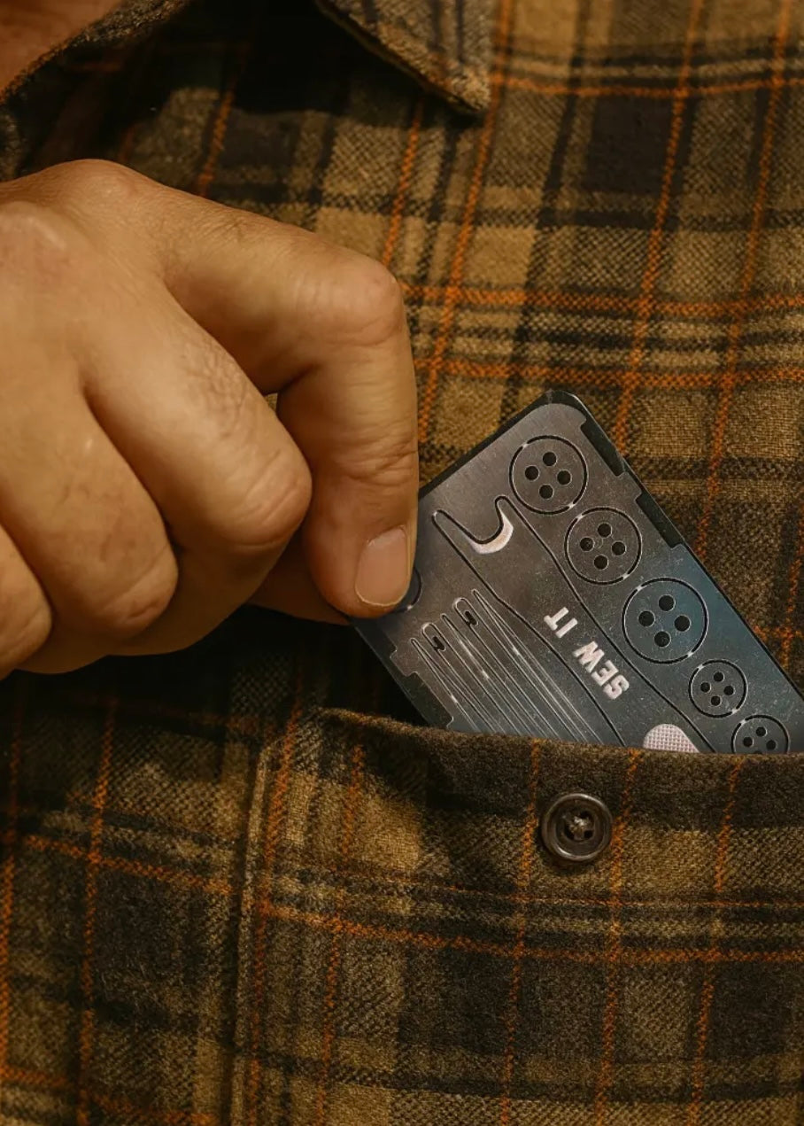 A sewing kit in your wallet! The "Sew it Up" Card is part of the NEW Adventure Card series by Lucky Jack! Fix popped buttons, or loose seams anywhere you go - a great gift for anyone who has ever been embarrassed, or inconvenienced by a lost button! Includes buttons, needles, and thread (even a seam ripper!).
