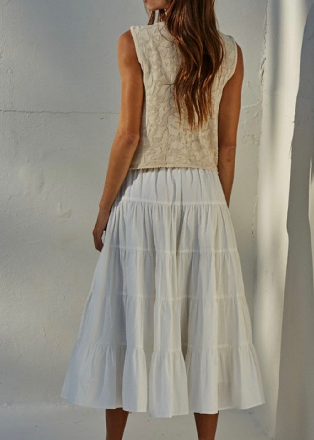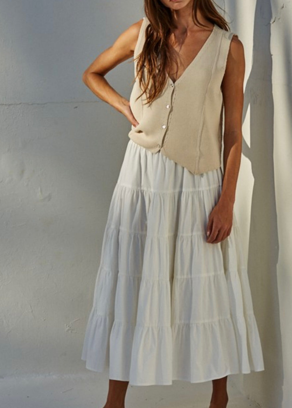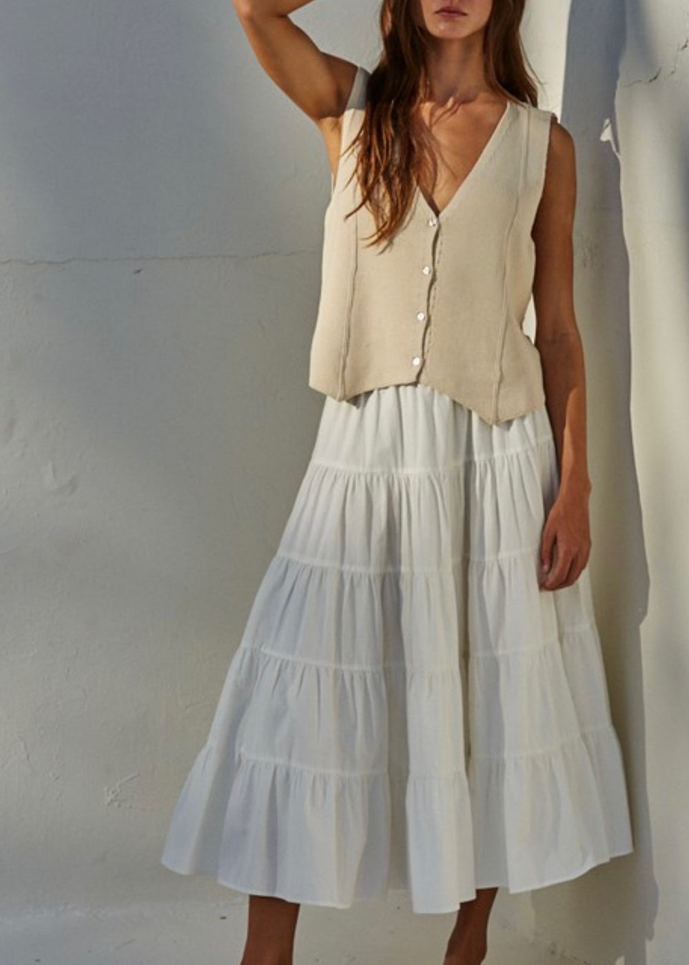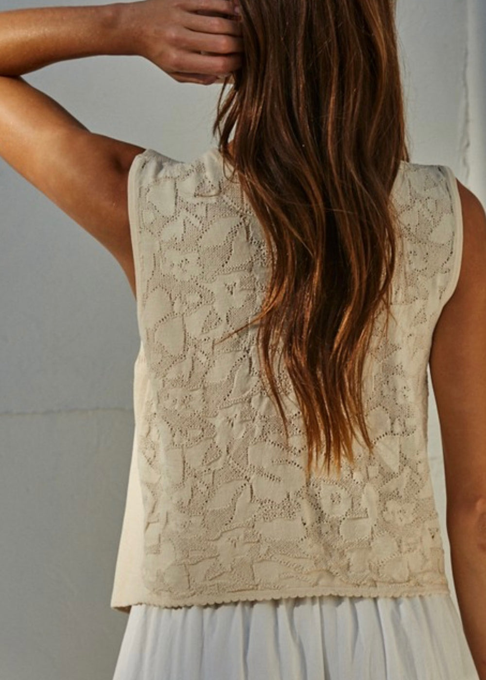 The Flora Sweater Vest is a knit sleeveless top made of viscose and nylon. It features a beautiful flower pattern on the back and has a button down V-neck design. Add this stylish and comfortable vest to your wardrobe today.