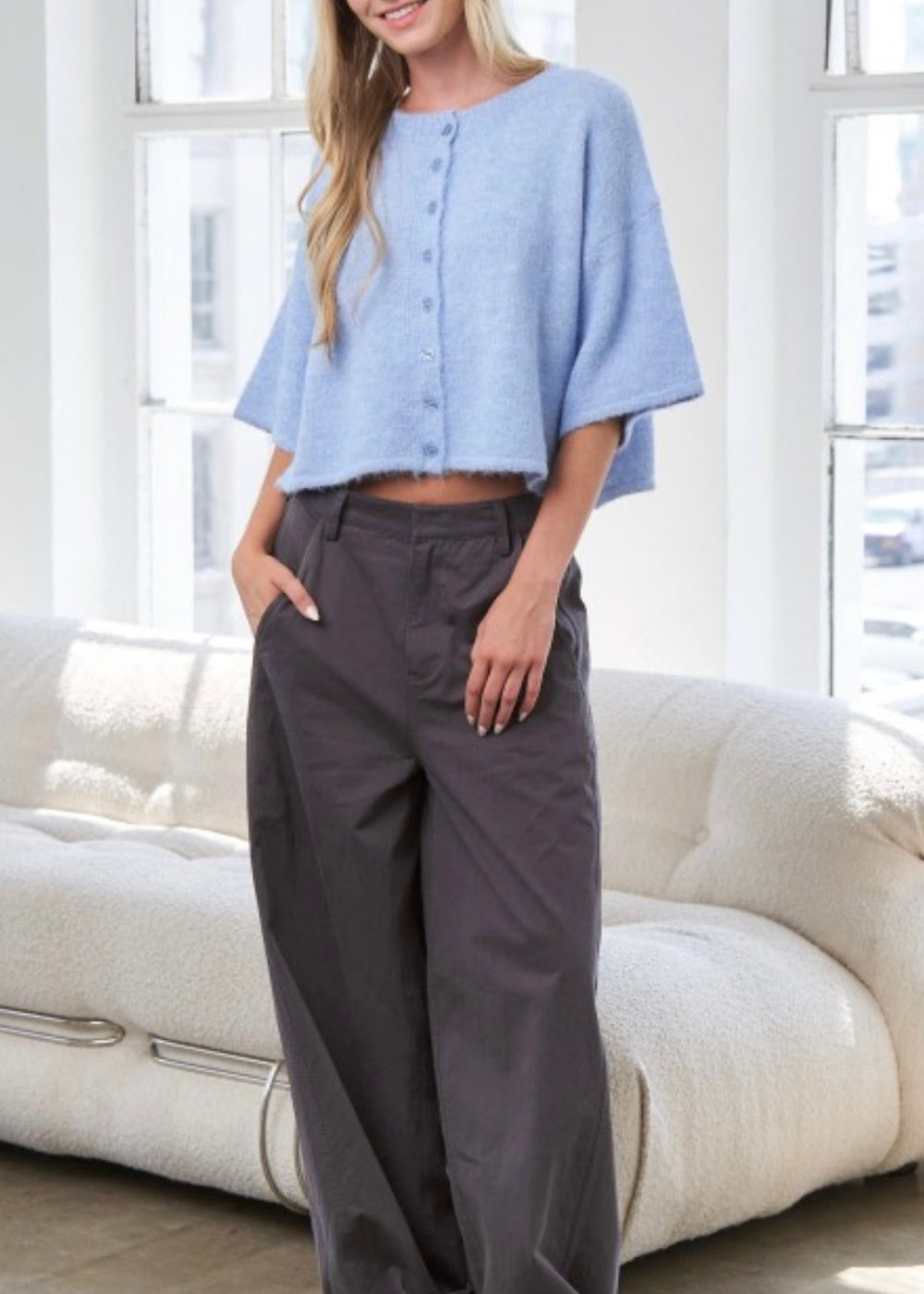 Introducing the Frankie Sweater—our crowd-pleasing favorite that's as comfy as it is chic! This bestseller features a luxuriously soft brushed knit that feels amazing against your skin. Rock the relaxed drop-shoulder silhouette and those fabulous wide 3/4 sleeves for effortless style. Button up the front, enjoy the cozy ribbed crew neckline and hem, and appreciate the perfect blend of lightweight comfort with just enough stretch to move with you. Crafted from a thoughtful mix of polyester, nylon, acrylic, wool, and spandex—the ultimate feel-good sweater that works as hard as you do.