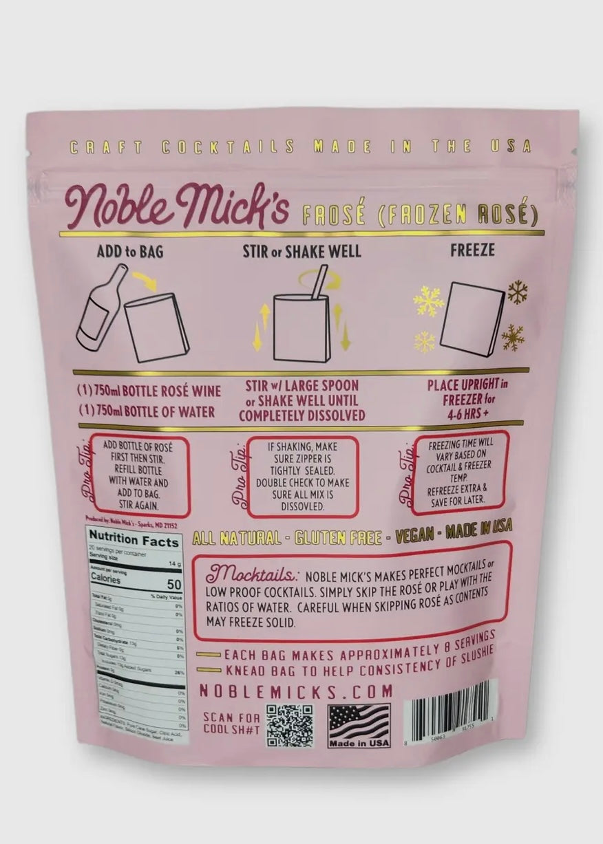 Frozen Cocktails don't get easier than this! Each bag makes 8 servings. No blenders ever! Simply add 1 bottle of Rose' and 1 bottle of water, shake or stir and throw in the freezer. Our Frozen cocktails are unique in you ONLY ever add water and spirit...NEVER any juice, mixers or additional flavors. Thats one of the things that sets us apart. 100% all natural ingredients and perfect to share with friends and family at your next party. Cheers from Noble Mick's