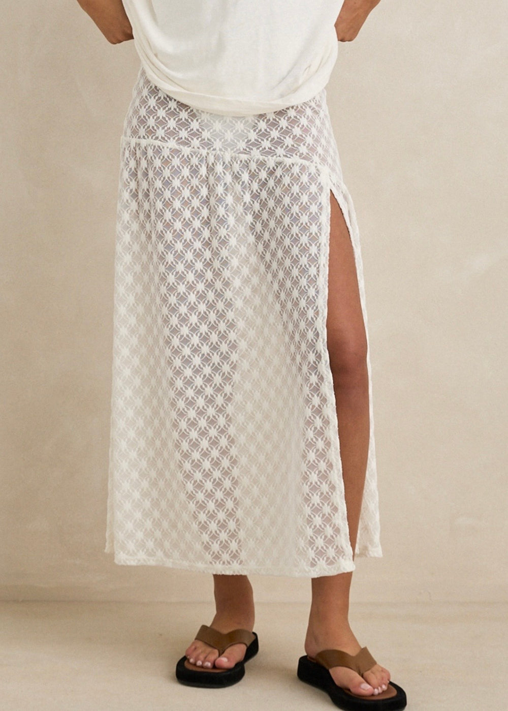 Romantic and lightweight, the Gigi Lace Maxi Skirt in White features a mid-low rise fit, flowing hemline, and delicate baby lock edges. Made from soft velvet lace, it’s sheer, feminine, and perfect for layering.