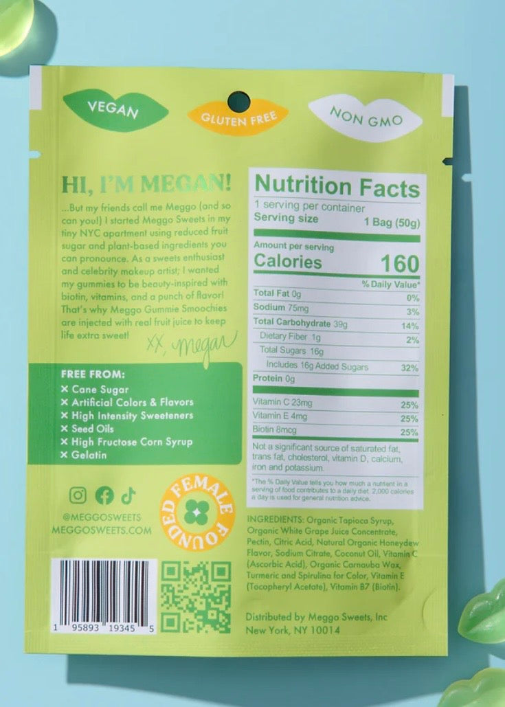 Experience the refreshing, one-of-a-kind taste of honeydew—one of our favorite flavors when creating Smoochies! Crafted with premium ingredients like organic fruit juice concentrate, vitamins, and a carefully balanced blend of turmeric and spirulina, these gummies boast a naturally vibrant color and a flavor that’s pure honeydew bliss. Each bite is a dew-licious treat you won’t want to miss.