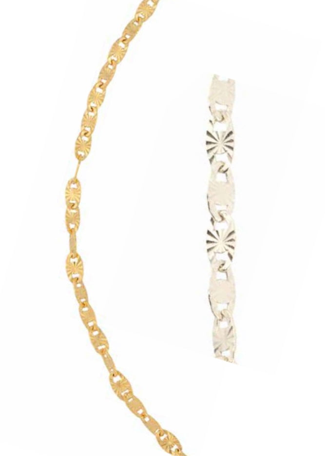 We use 925 sterling silver, 18k gold vermeil (gold over sterling silver), and 10k, 14k, and 18k solid gold. This includes our chains, clasps, earrings, and posts.