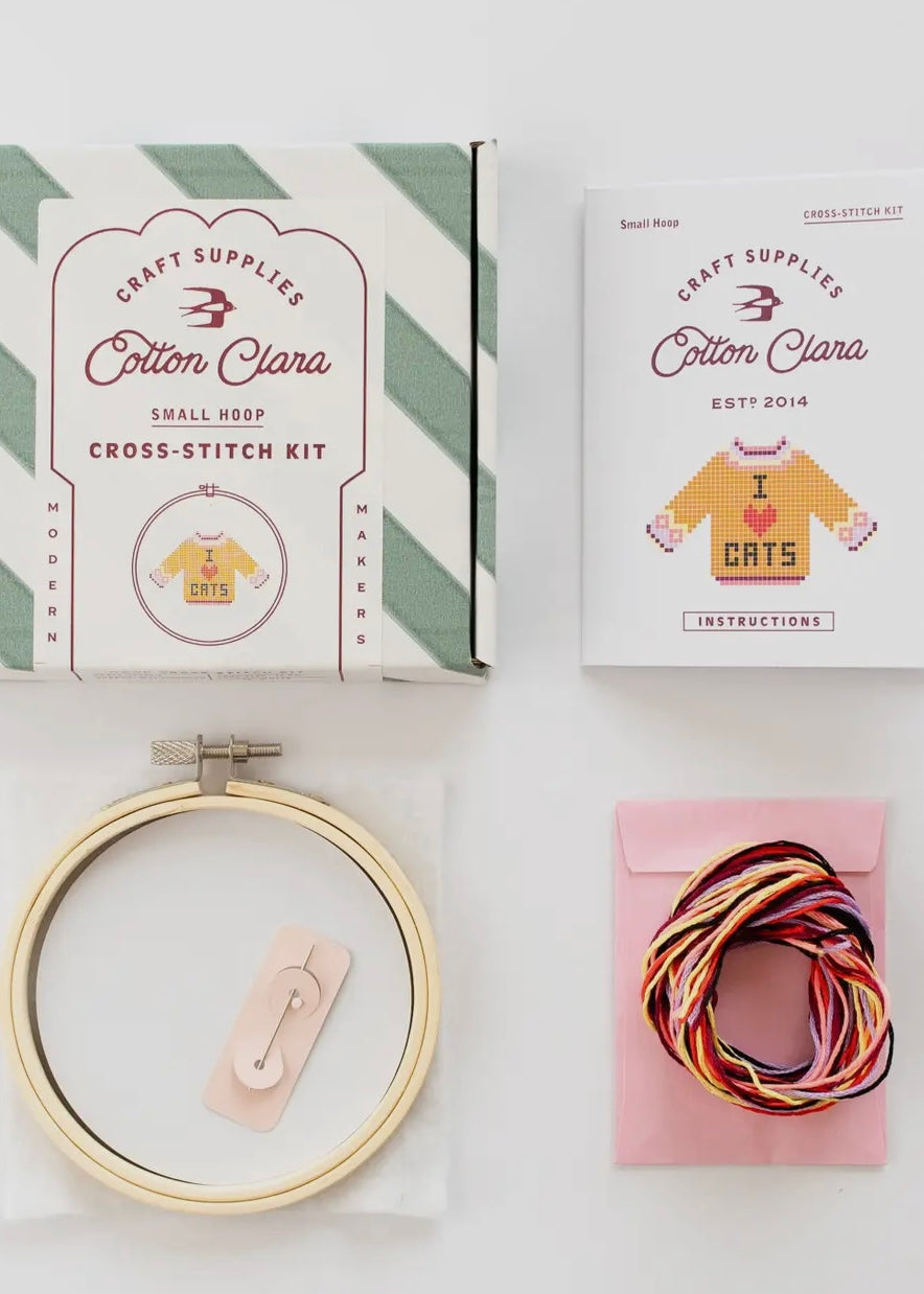 I Love Cats Mini Cross Stitch Kit – Purr-fect Beginner Craft for Cat Lovers (11cm Hoop) Show your love for feline friends with our I Love Cats Mini Cross Stitch Kit – a charming, beginner-friendly project perfect for cat owners, pet shops, and crafty gift givers. This counted cross stitch kit includes a sweet cat-themed design and all the materials you need to complete it with ease. Each kit contains: 11cm wooden embroidery hoop, white aida fabric (not printed), embroidery thread, blunt needle, wadding, full-colour stitch chart, instructions, and a backing disc for display.