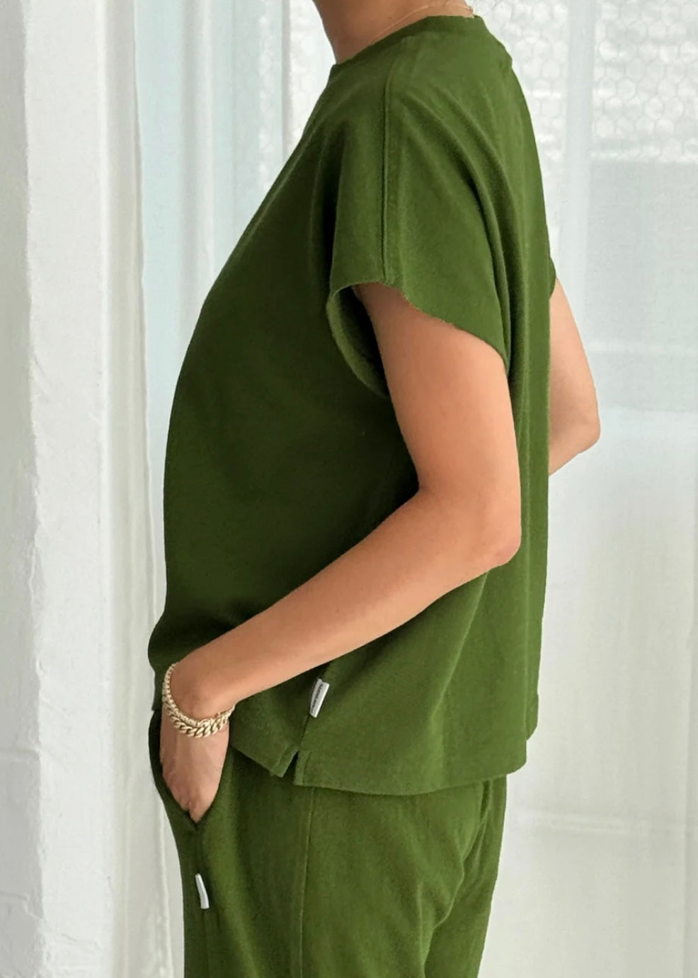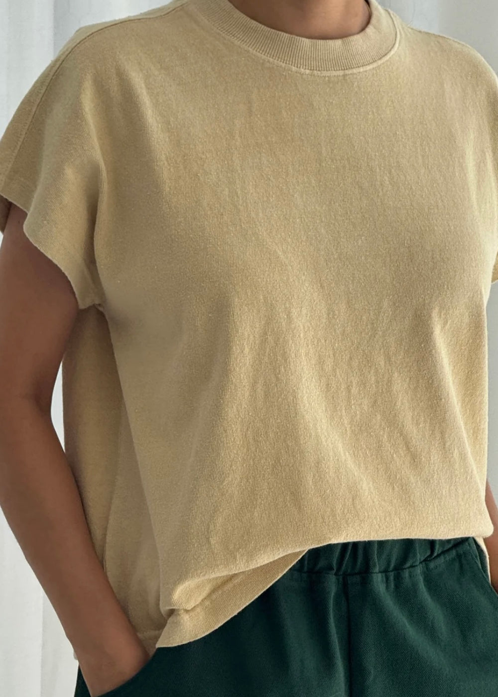 Jeanne Tee is our perfect muscle tee. She features a shorter length to pair perfectly with high waisted bottoms but still give enough coverage for mid-rise bottoms and just the right amount of off shoulder dolman sleeve. She has a high crew neck with an extra wide neckband that adds to her signature charm.