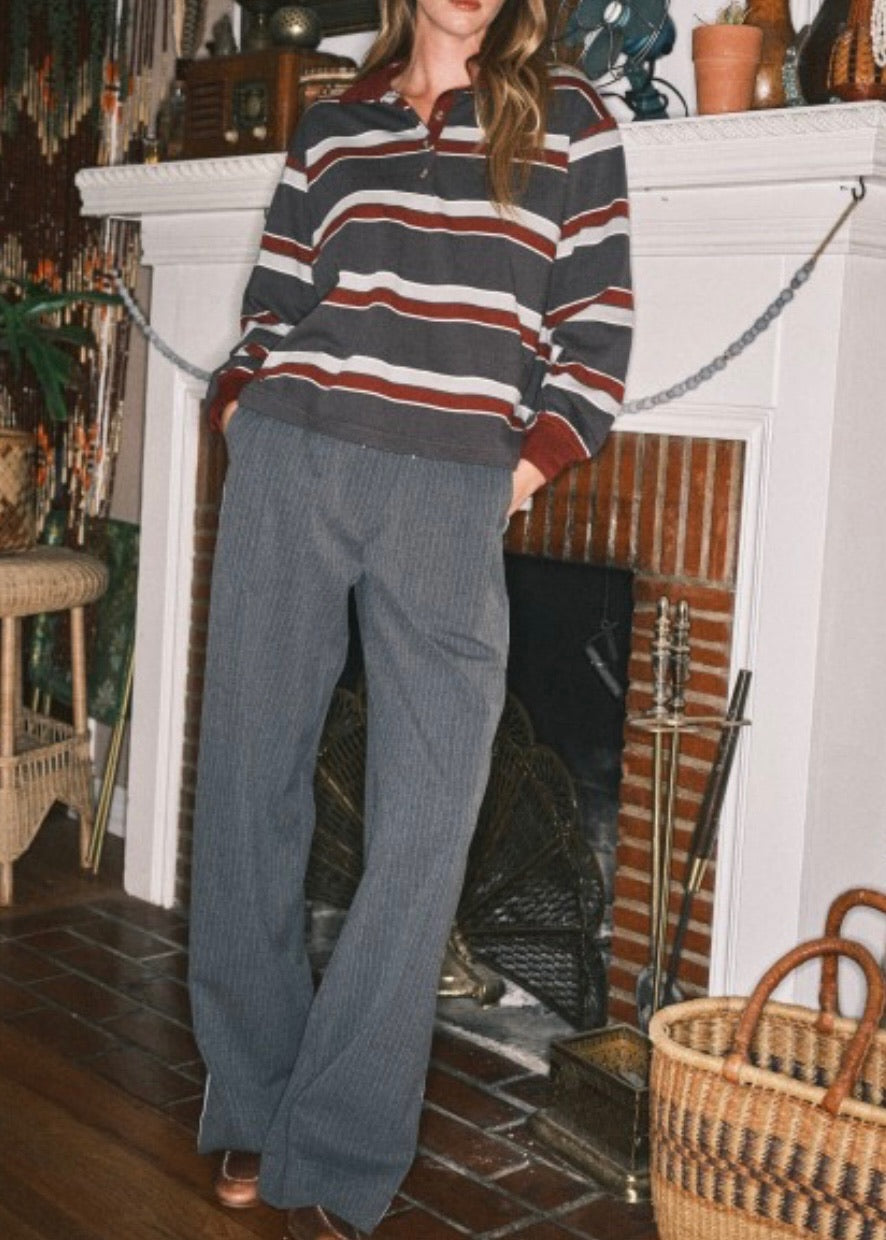 Vintage charm meets modern comfort. This oversized piece showcases a striking multi-stripe design that instantly elevates any casual wardrobe. The relaxed boyfriend silhouette drapes beautifully, while the buttoned collar adds timeless sophistication. Ribbed cuffs and hem provide a polished touch and gentle stretch for all-day wearability. Crafted from a breathable cotton-polyester blend, it's the perfect layering piece or standalone statement. Versatile, comfortable, and undeniably cool.