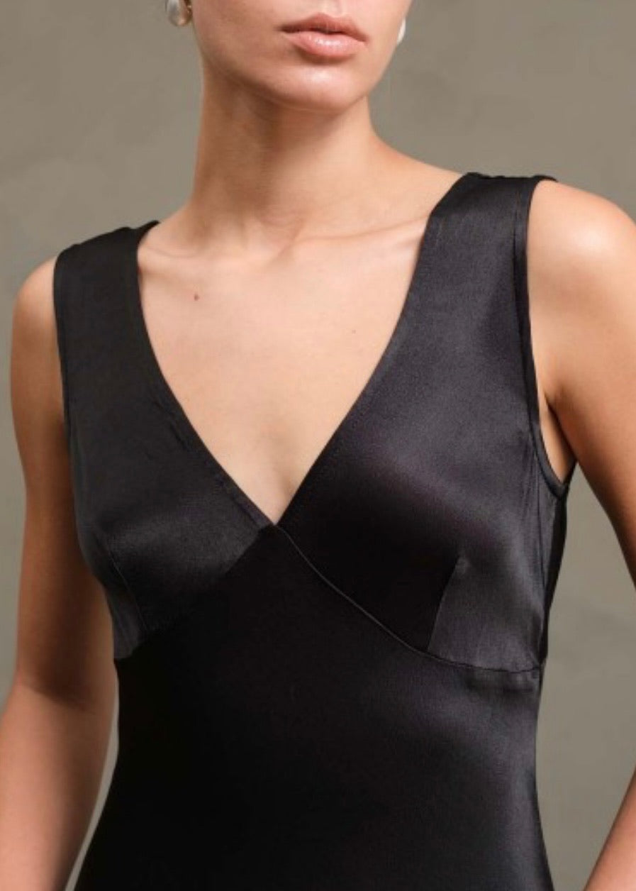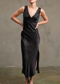 The Late Nights Dress is a bias-cut midi featuring a v-neckline and a side slit for added movement. Crafted from a fluid satin fabric with a gentle sheen, it comes in Black and Slate Blue. Made from 60% Rayon and 40% Viscose, this dress adapts seamlessly from day to evening wear. Available in sizes small to large with a 3-2-1 pack ratio. The model is 173 cm (5FT 8IN) tall and wears a size small.