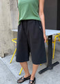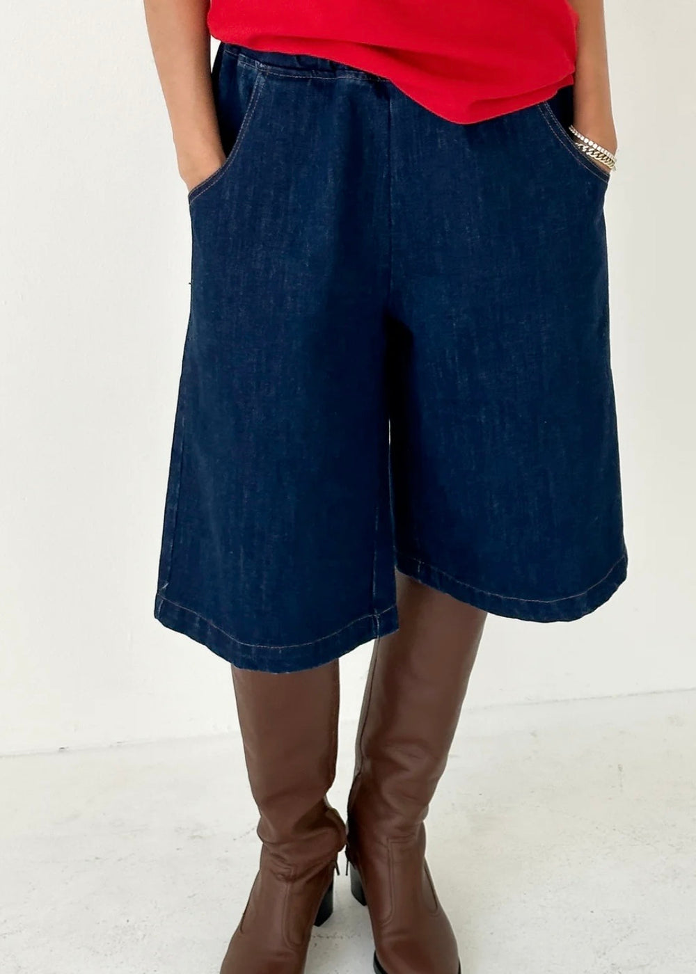 The Liam Shorts offer a modern twist on the classic Bermuda. They feature an elasticated waistband for comfort, side seam pockets, and a relaxed fit with slightly flared panels for added shape. The elongated inseam and subtle A-line silhouette make them easy to wear from day to night.