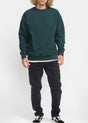 The Revolution evergreen loose-fitted sweatshirt with a round neck and rib-ends at sleeve and bottom, made of an organic cotton-sweat, with a weight of 420 GSM. The heavy-weight sweat-fabric with a crispy hand-feel ensures stability and durability to the sweatshirt. The organic cotton is grown from non-genetically modified seeds without chemical fertilizers or pesticides, which enhances biodiversity, and with less impact on the ecological balance. The crewneck sweatshirt has a small Revolution "R"-embroidery at the bottom back, and a brand-label on the front, and all seams are flat-locked for a casual look