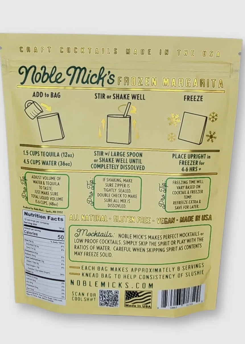 Frozen Cocktails don't get easier than this! Each bag makes 8 servings. No blenders ever! Simply add 1 bottle of Rose' and 1 bottle of water, shake or stir and throw in the freezer. Our Frozen cocktails are unique in you ONLY ever add water and spirit...NEVER any juice, mixers or additional flavors. Thats one of the things that sets us apart. 100% all natural ingredients and perfect to share with friends and family at your next party. Cheers from Noble Mick's