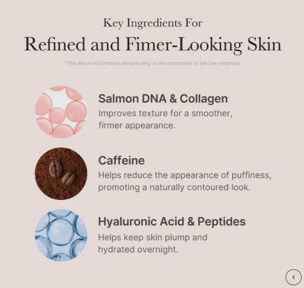 Size: 75 ml/ 2.53 fl.oz Wake up to a firmer, glowier skin with overnight peel-off mask that enhances the appearance of facial contours and hydrates by morning. Elevate your self-care ritual with a shimmering pink pearl mask that creates a glowy, skin-hugging film. It nourishes deeply — leaving your skin visibly refreshed and radiant after long nights or tiring days. A powerful blend of PDRN and Caffeine supports the skin’s moisture barrier while enhancing skin’s natural contours for a firmer, more refined appearance. HOW TO USE 1. After cleansing, generously apply toner to cream on your clean face. 2. Complete your skincare routine by applying an even layer of the wrapping mask to your face. Use a brush or a spatula for smooth application, ensuring to avoid the eyebrows, hairline, eyes, and lips. 3. Let it dry for about 15 minutes, then go to sleep. 4. The next morning, gently remove the wrapping mask by peeling it from the edges or thoroughly rinse it off with lukewarm water to reveal refreshed skin.
