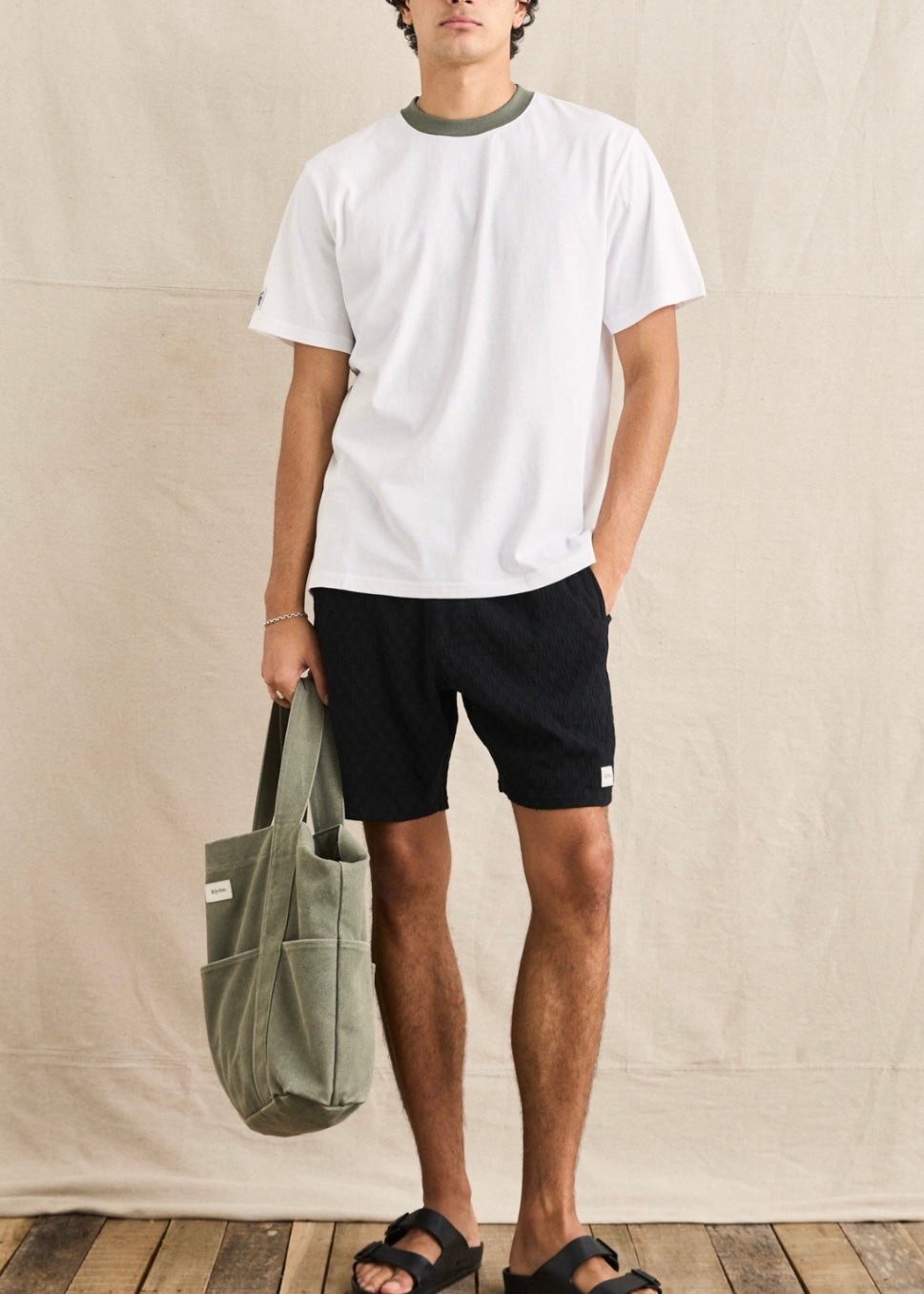 The Merge Vintage SS T-Shirt offers a relaxed, sun-faded look with a contrast collar and woven label detail at the sleeve hem. Designed with a classic vintage block and finished with Rhythm trims, it’s an effortless staple for everyday wear. Soft-washed for that lived-in coastal feel.
