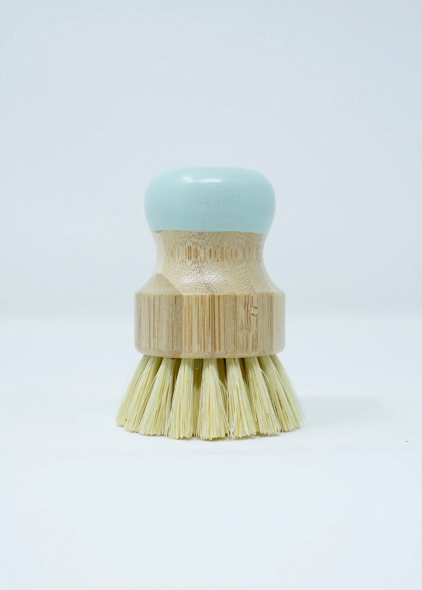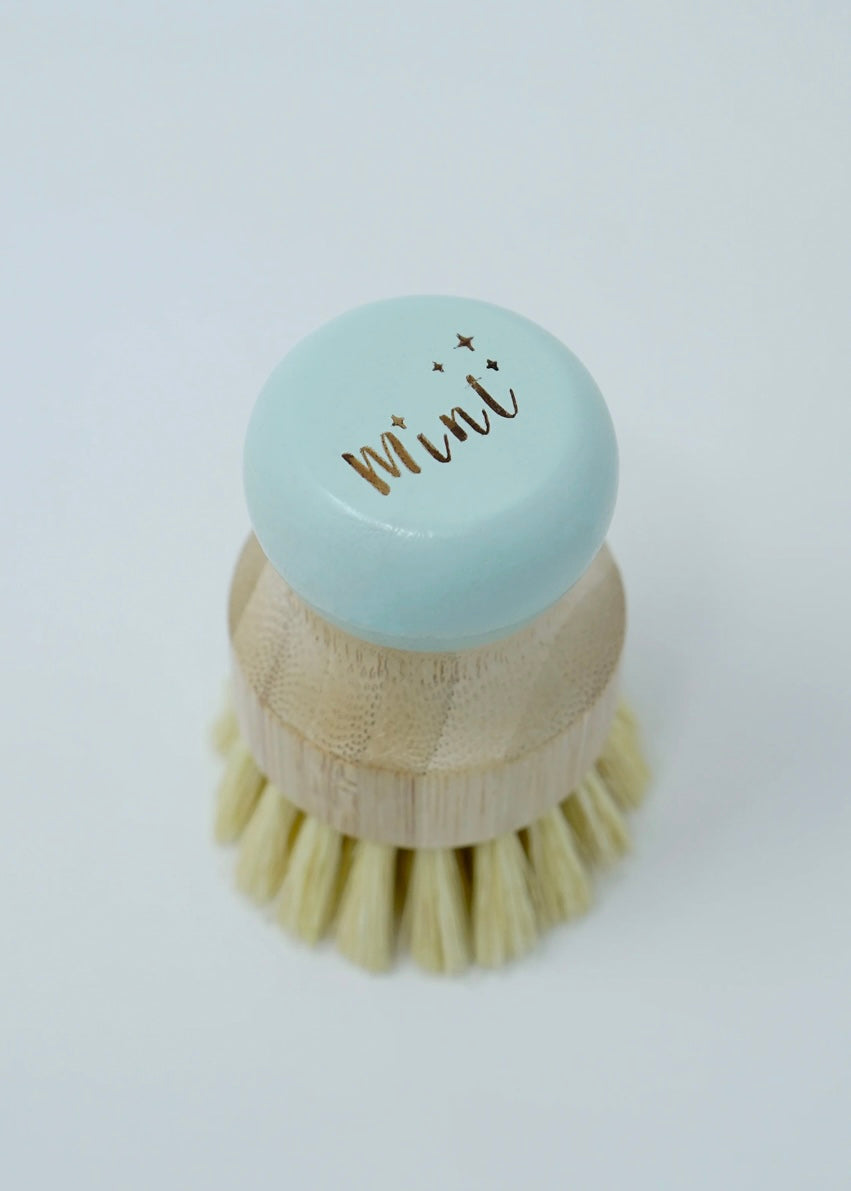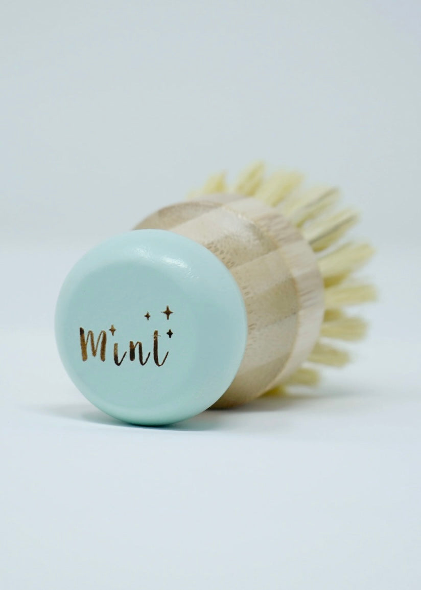 All natural Mint engraved Bamboo Dish Brush with stiff bristles. An effective cleaning tool for pots pans, plates, grout, upholstery stains and even scrubbing produce! The ergonomically designed handle fits in the palm of your hand and gives you serious scrubbing power. 100 % compostable.