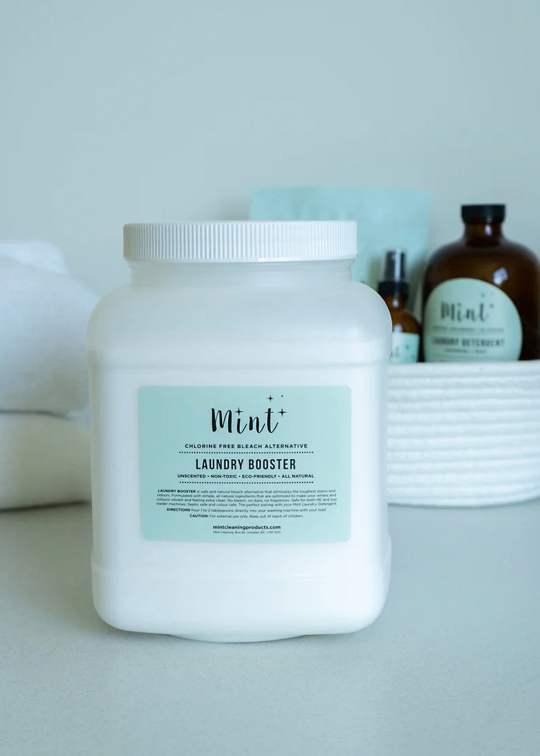 Mint Laundry Booster is a safe and natural bleach alternative that eliminates the toughest stains and odours. Formulated with simple, all natural ingredients that are optimized to make your whites and colours vibrant and feeling extra clean. No bleach, no dyes, no fragrances, just the good stuff! Safe for both HE and top loader machines. Septic safe and colour safe. The perfect pairing with your Mint Laundry Detergent.