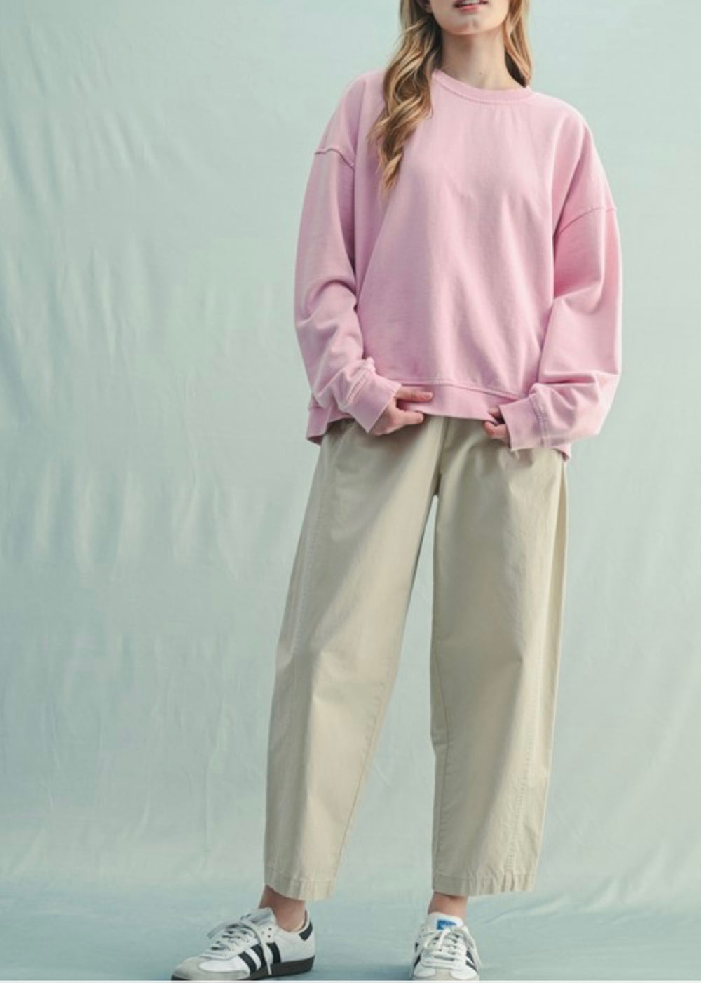 The Percy Sweatshirt is crafted from washed French terry fabric, offering a soft and comfortable feel. The main body is made of 100% cotton, while the ribbed sections combine 96% cotton with 4% spandex for added stretch and durability. This blend ensures both comfort and a refined fit.