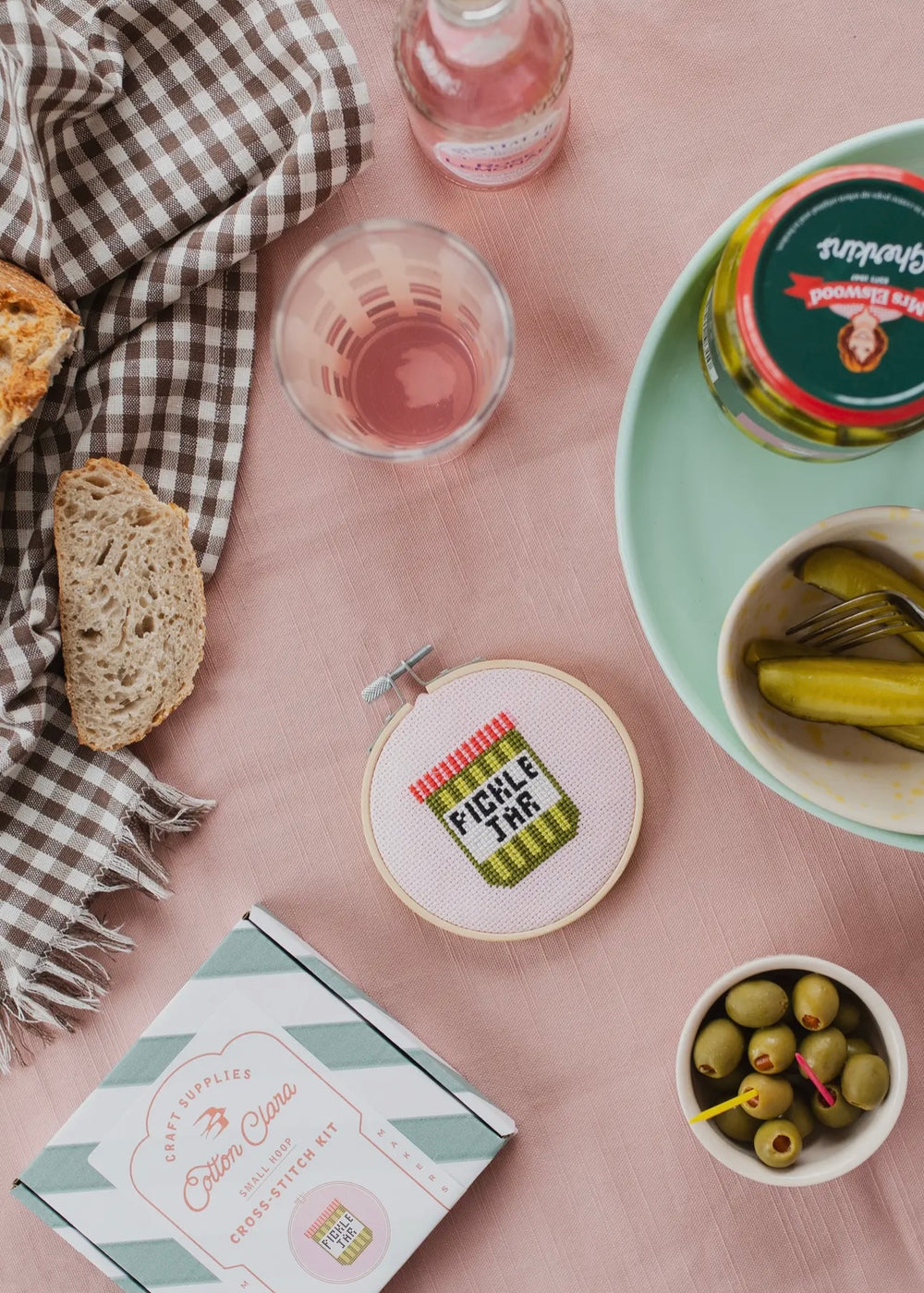 Pickle Jar Mini Cross Stitch Kit – 11cm Modern Embroidery Kit for Beginners & Foodie Fans One of our bestselling designs, the Pickle Jar Mini Cross Stitch Kit is a must-have for foodies, kitchen décor lovers, and crafty gift-givers. Part of our playful foodie collection alongside Kimchi, Olives, and Peanut Butter, this kit is packed with charm and nostalgia. Ideal for beginners, this counted cross stitch kit includes everything you need: an 11cm wooden embroidery hoop, coloured Aida fabric (not pre-printed), embroidery thread, blunt needle, wadding, full-colour chart, instructions, and a glue-free backing disc for easy finishing.