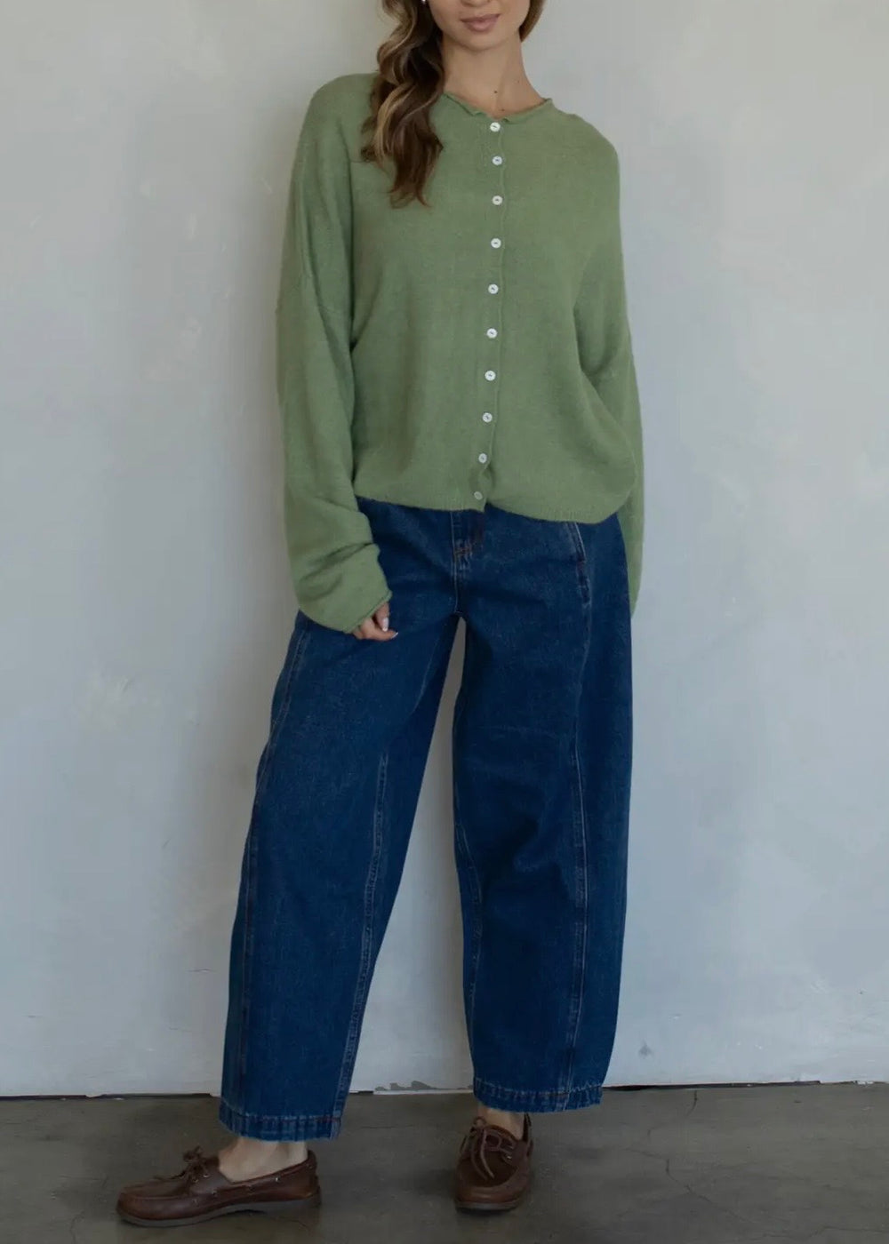 Soft and cozy lightweight cardigan with rolled edge finish on the sleeves and collar.