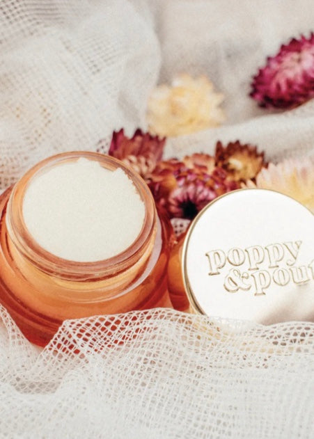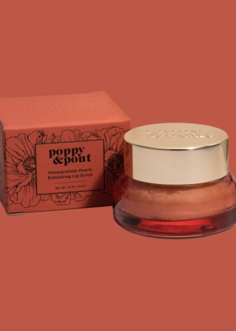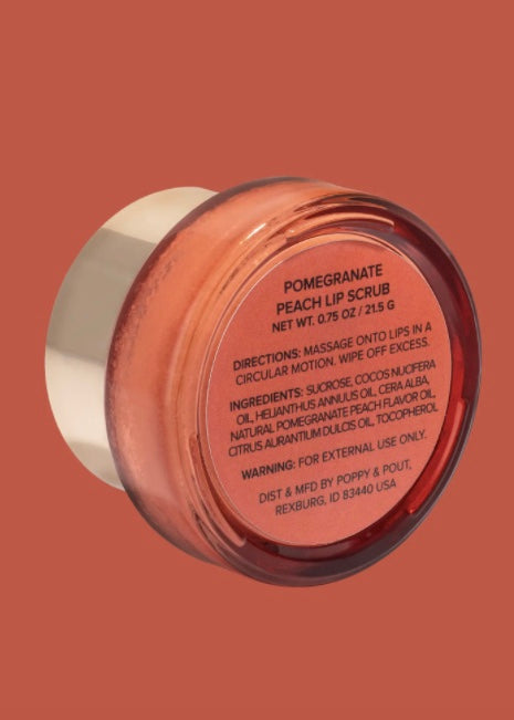 FLOWER POWERED LIP SCRUB | POMEGRANATE PEACH- Poppy & Pout's Exfoliating Lip Scrubs are the perfect way to prep your pout for smooth, hydrated lip balm application. We use a clean combination of natural ingredients to help clean and gently exfoliate your lips.