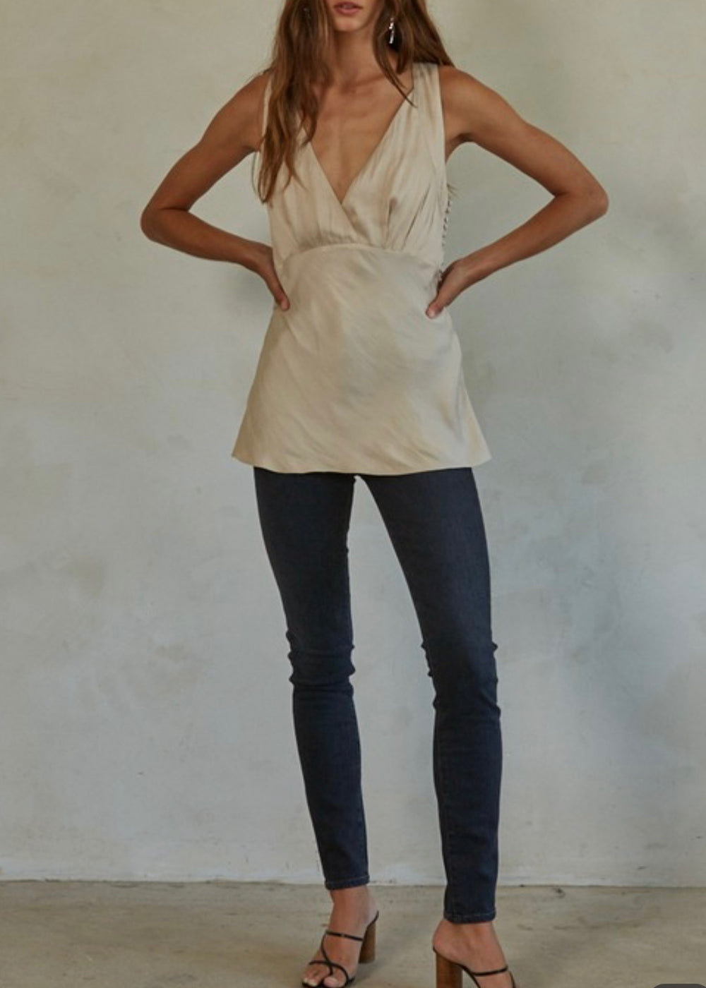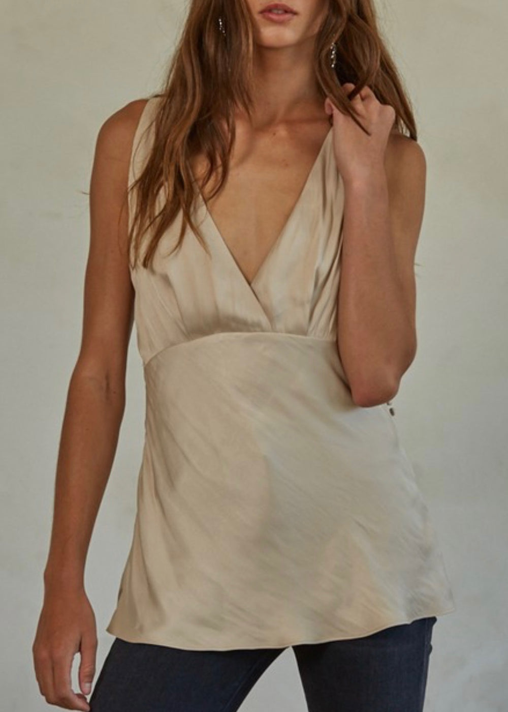The Porto Tunic Top is woven polyester satin and features a flattering surplice v-neck, sleeveless design, and unique back crossed straps with side buttons. Made of 100% polyester fabric, this top offers a luxurious and stylish look for any occasion.