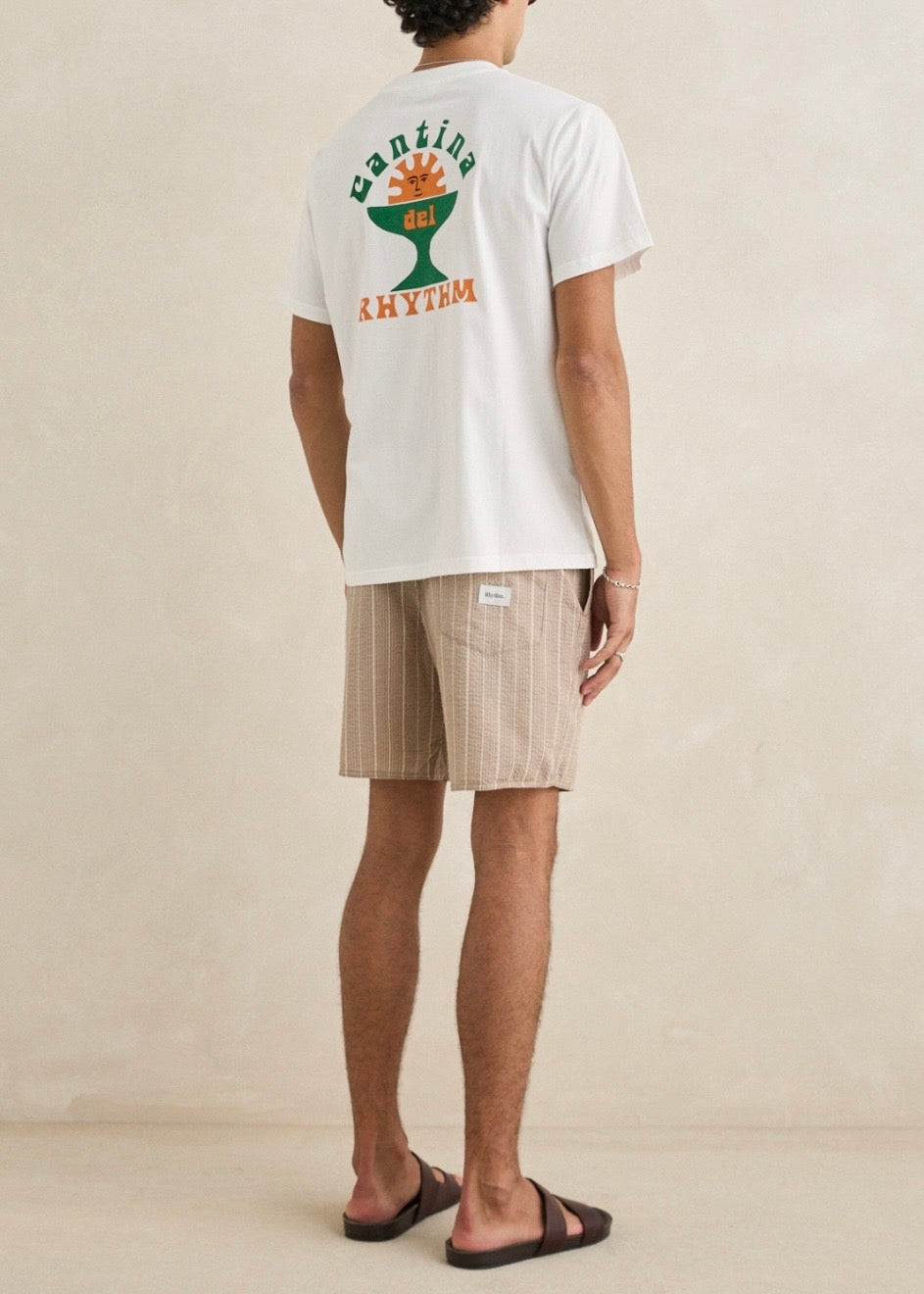 COTTON BLEND SEERSUCKER 17 INCH OUTSEAM,STANDARD FIT, ELASTIC WAISTBAND, COTTON DRAWSTRING, SIDE SEAM HAND POCKETS, BACK PATCH POCKET, RHYTHM LABELS & TRIMS
