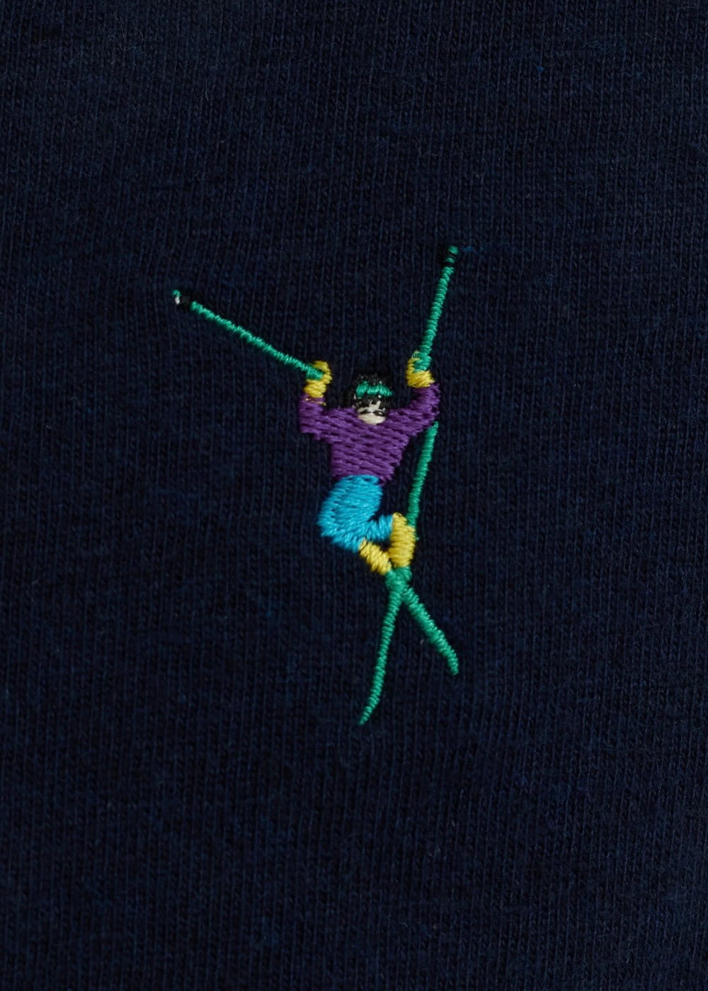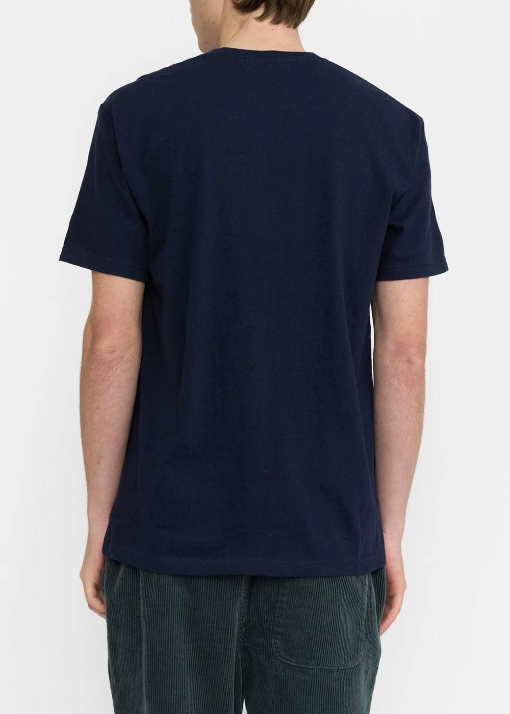 Loose-fitted t-shirt with a round neck and short sleeves, made in a mélange organic cotton-jersey, with a weight of 200 GSM. The t-shirt features a small fun, colorful embroidery on the chest, a rib collar and the hem is made with a twin needle stitch. The finishing of the t-shirt adds softness and ensures stability and durability to the style