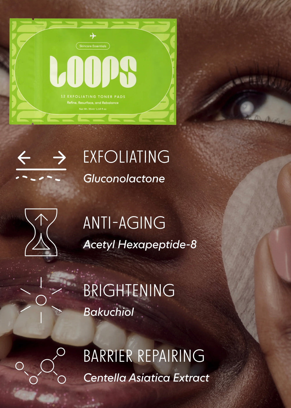 Our Exfoliating Toner Pads rapidly resurface uneven skin texture and fights signs of aging by boosting your skin's cellular renewal process. Gluconolate helps gently slough off dead skin cells to reveal a softer, smoother complexion, while acetyl hexapeptide-8 relaxes the look of expression lines and wrinkles for a face that looks youthful and revived. Each biodegradable Bamboo pad comes pre-saturated, so you get a precise dose of exfoliating toner each time. For best results, use daily after cleansing.