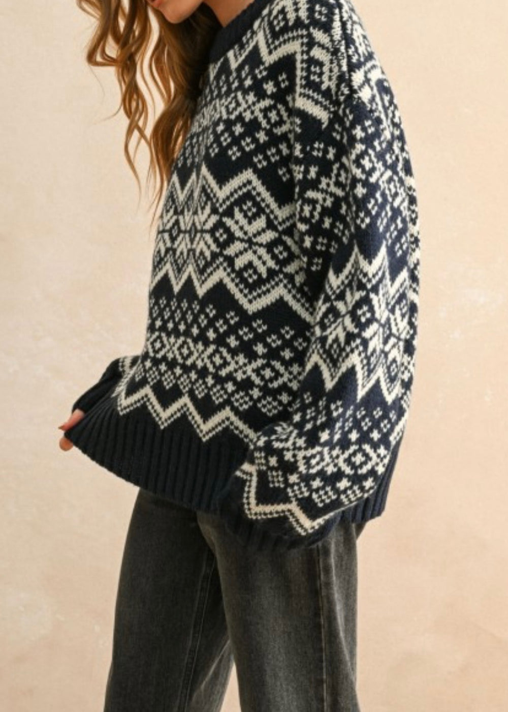 Our Snow Flake Sweater looks absolutely stunning on our model, who's rocking a size S! She stands 5'7½" (175.3cm), so you can get a real sense of how this cozy piece drapes and fits. Perfect for sizing up your winter wardrobe with style.