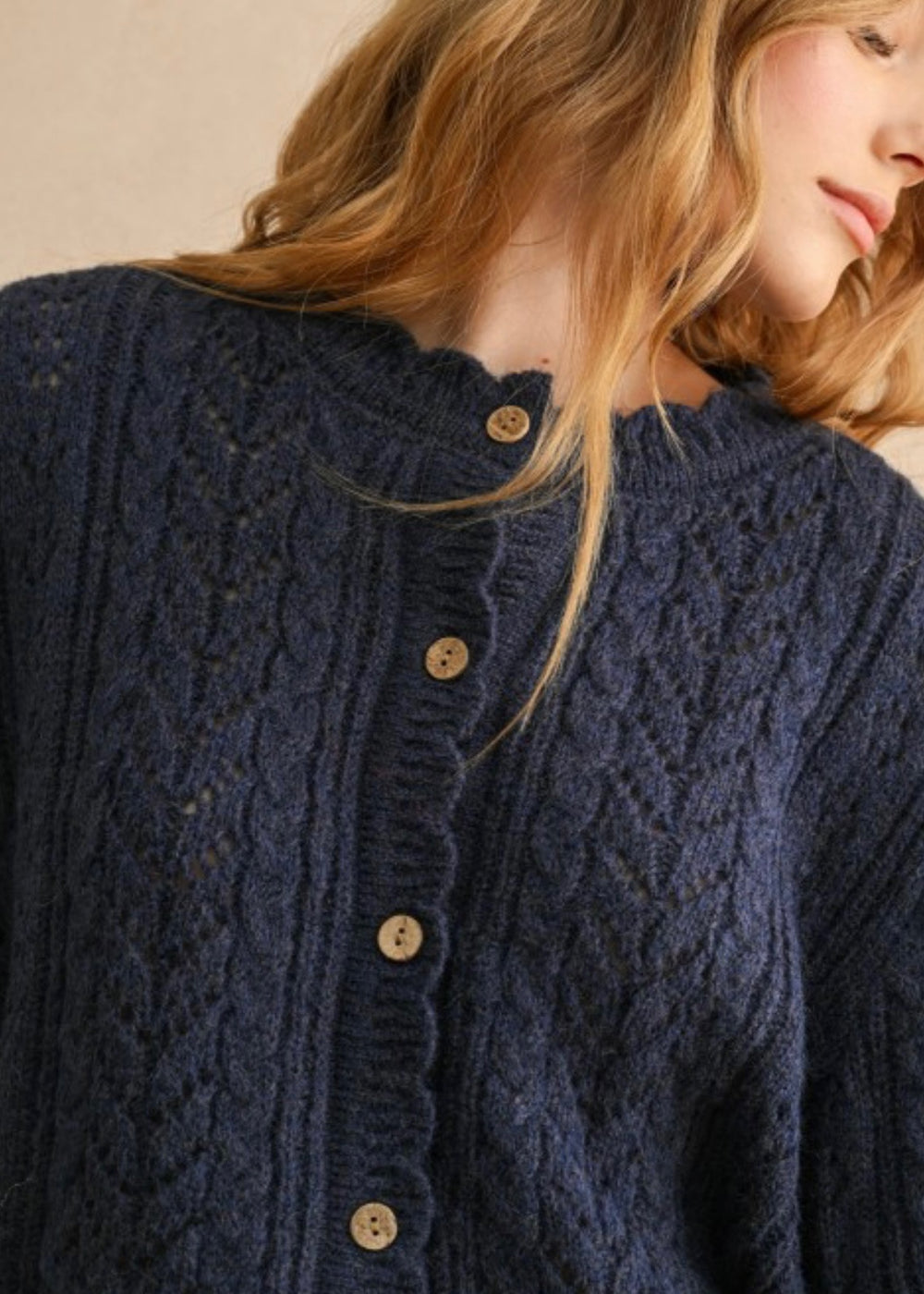 Reach for the stars in this charming cable knit cardigan! Featuring a classic button-front design with a lightweight feel, it's perfect for layering on cooler evenings. Our model (5'7½") showcases the size S beautifully—ideal for those who love cozy style without the bulk. Whether you're stargazing or simply adding a touch of whimsy to your wardrobe, this cardigan is your new go-to piece.