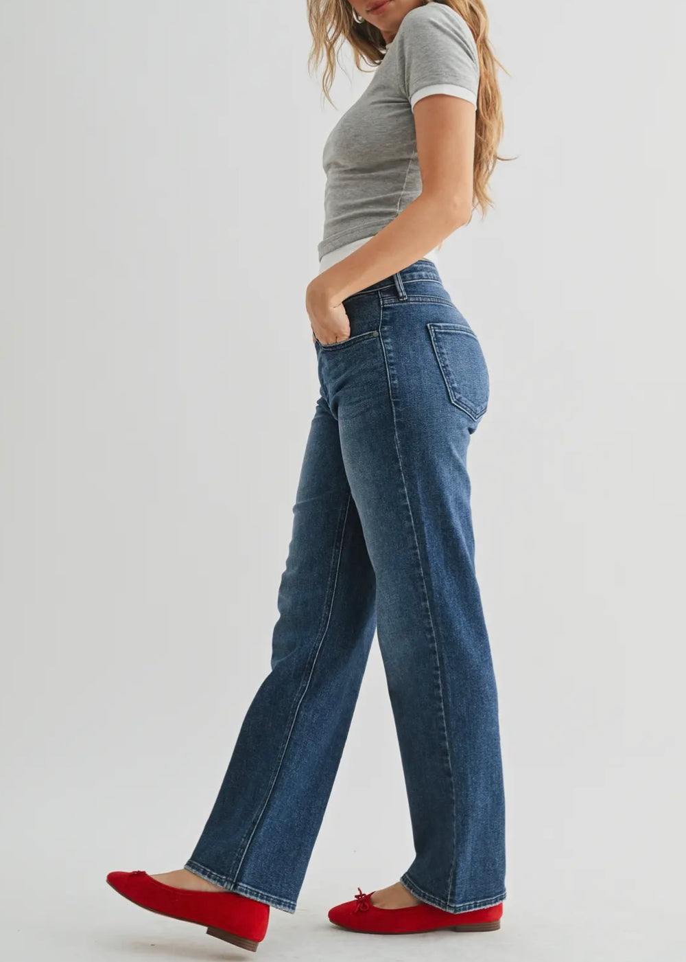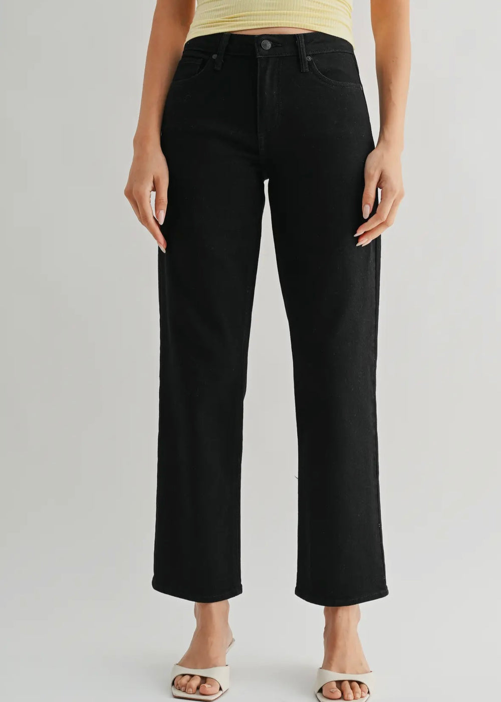 Just Black Denim's Stretchy Straight jeans have a 9.5" rise (mid to high rise) and a straight leg from thigh to ankle. Stretchy & comfortable, the jeans you know and love from JBD.