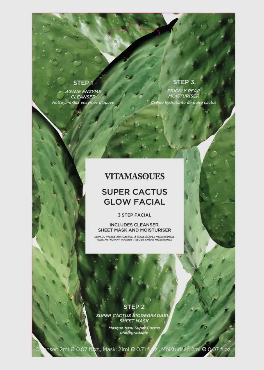 Step one contains an Agave Enzyme facial cleanser, which helps exfoliate built-up dirt. It also moisturises while being rich in Vitamins B1, B2, C, D, K and Pro-Vitamin A. Super Cactus Biodegradable Sheet Mask