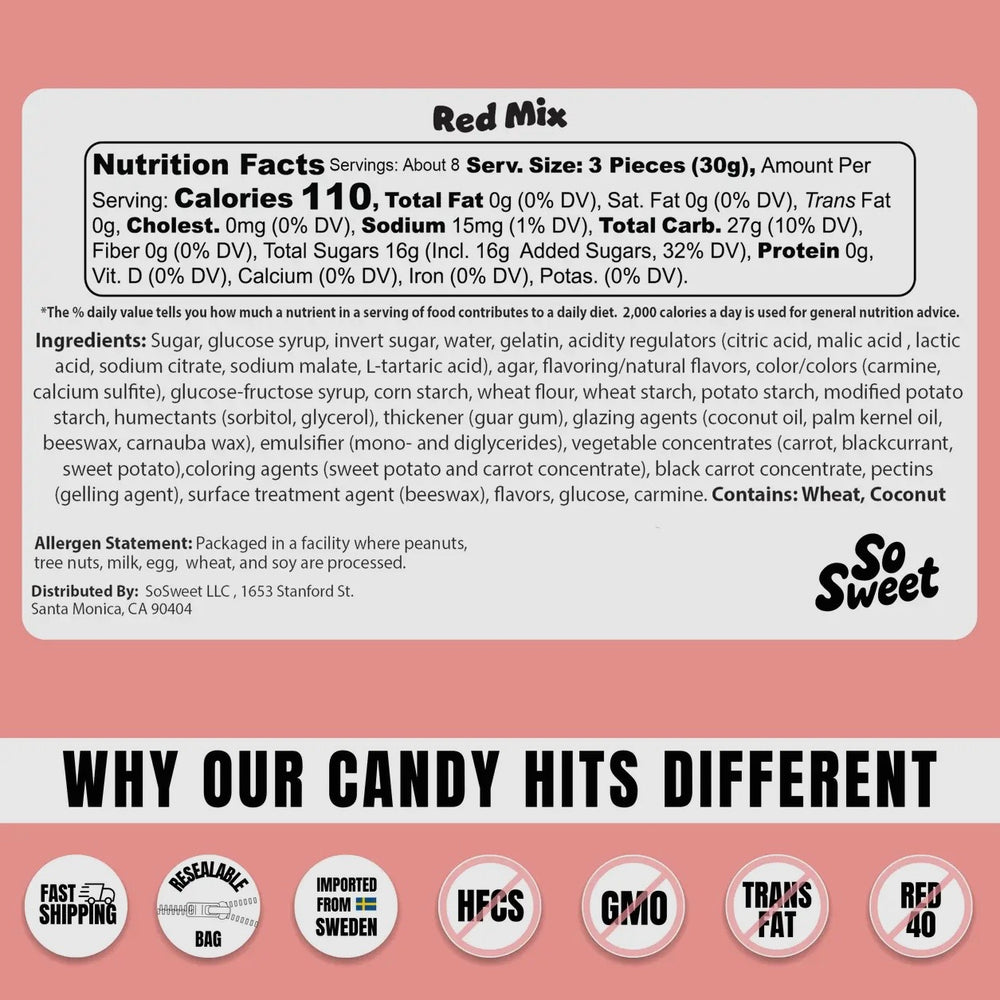 Get ready for a bold burst of berry flavor with our vibrant Swedish Candy Red Mix! Packed with classic red favorites like juicy strawberry, tangy raspberry, and sweet cherry, this mix delivers a perfect balance of sour, chewy, and soft textures. Every bite is a nostalgic throwback with a Scandinavian twist. A must-have for red candy lovers! 🇸🇪