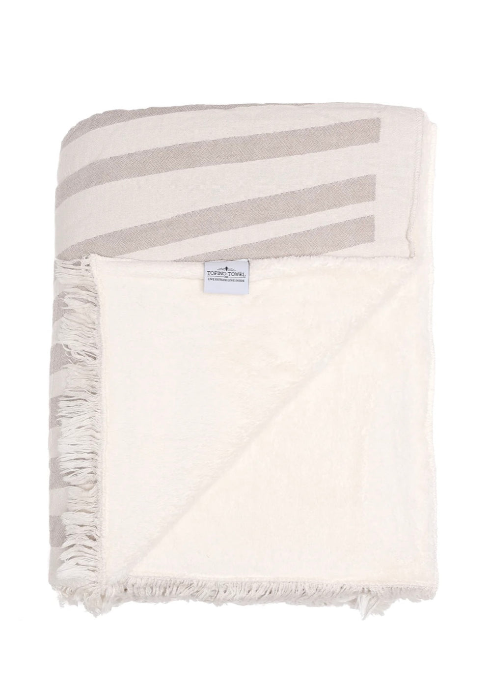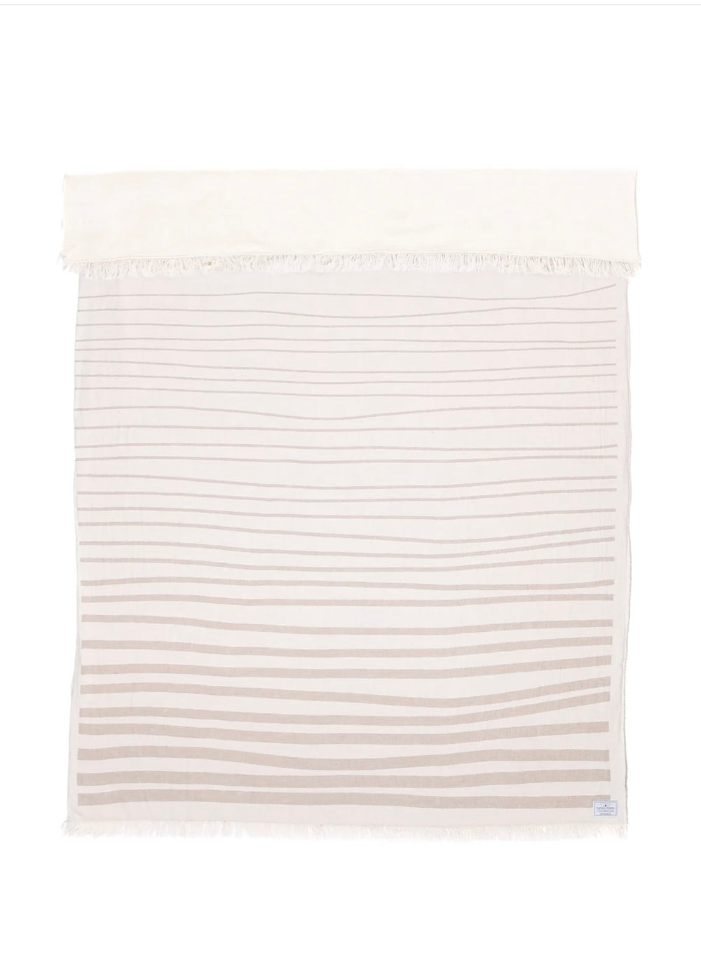Our custom designed Rowyn throw is made from super soft luxe Turkish cotton, eyelash fringe, and cozy fleece lining. Created to look like ripples on the ocean this neutral design brings tranquility to any space.
