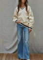 This varsity sweater features a knit blend of 50% polyester and 50% cotton, designed with a V-neck and long sleeves. Its oversized pullover silhouette is accented by a striped contrast ribbed trim, combining classic style with comfortable wear.